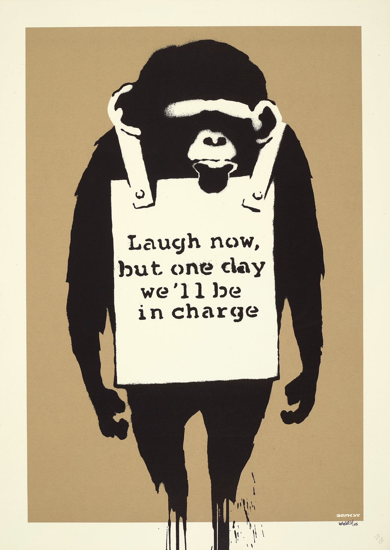 His graffiti, paintings and screenprints use whimsy and humour to satirically critique war, capitalism, hypocrisy and greed — with not even the Royal family safe from his anti-establishment wit.