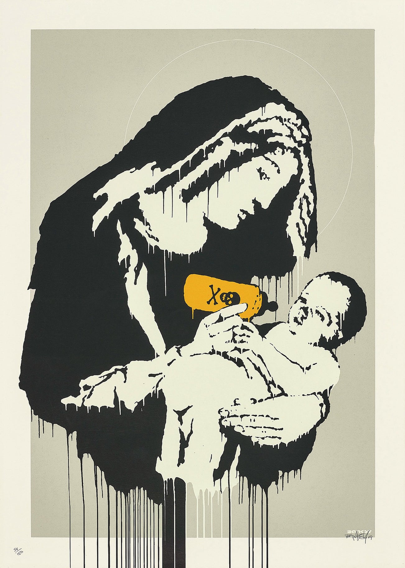 British | 1975Anonymous street artist Banksy first turned to graffiti as a miserable fourteen year old disillusioned with school. Inspired by the thriving graffiti community in his home city, Bristol, Banksy's works began appearing on trains and walls in 1993, and by 2001 his blocky, spray-painted works had cropped up all over the United Kingdom. Typically crafting his images with spray paint and cardboard stencils, Banksy is able to achieve a meticulous level of detail. His aesthetic is clean and instantly readable due to his knack for reducing complex political and social statements to simple visual elements.