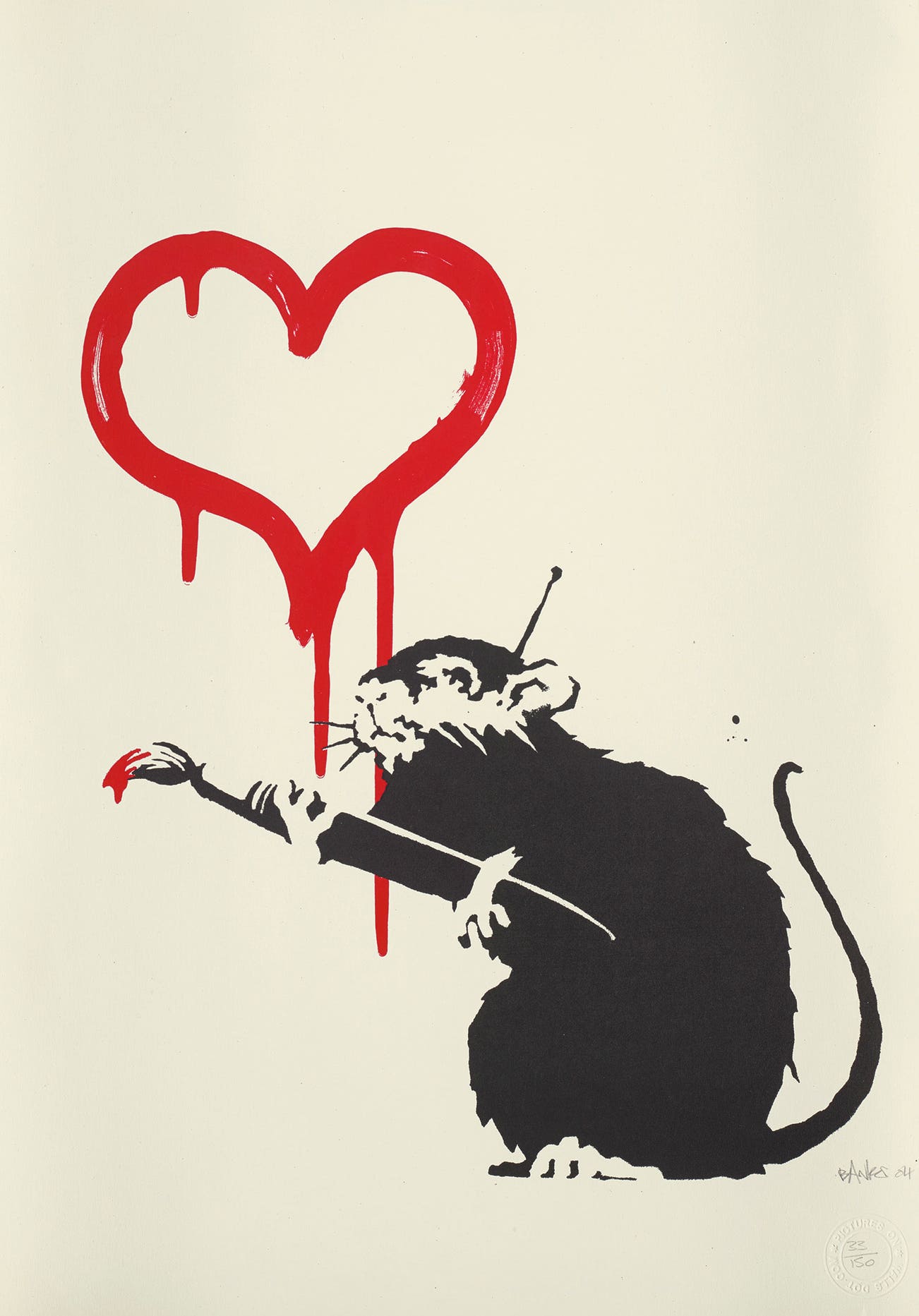 His graffiti, paintings and screenprints use whimsy and humour to satirically critique war, capitalism, hypocrisy and greed — with not even the Royal family safe from his anti-establishment wit.
