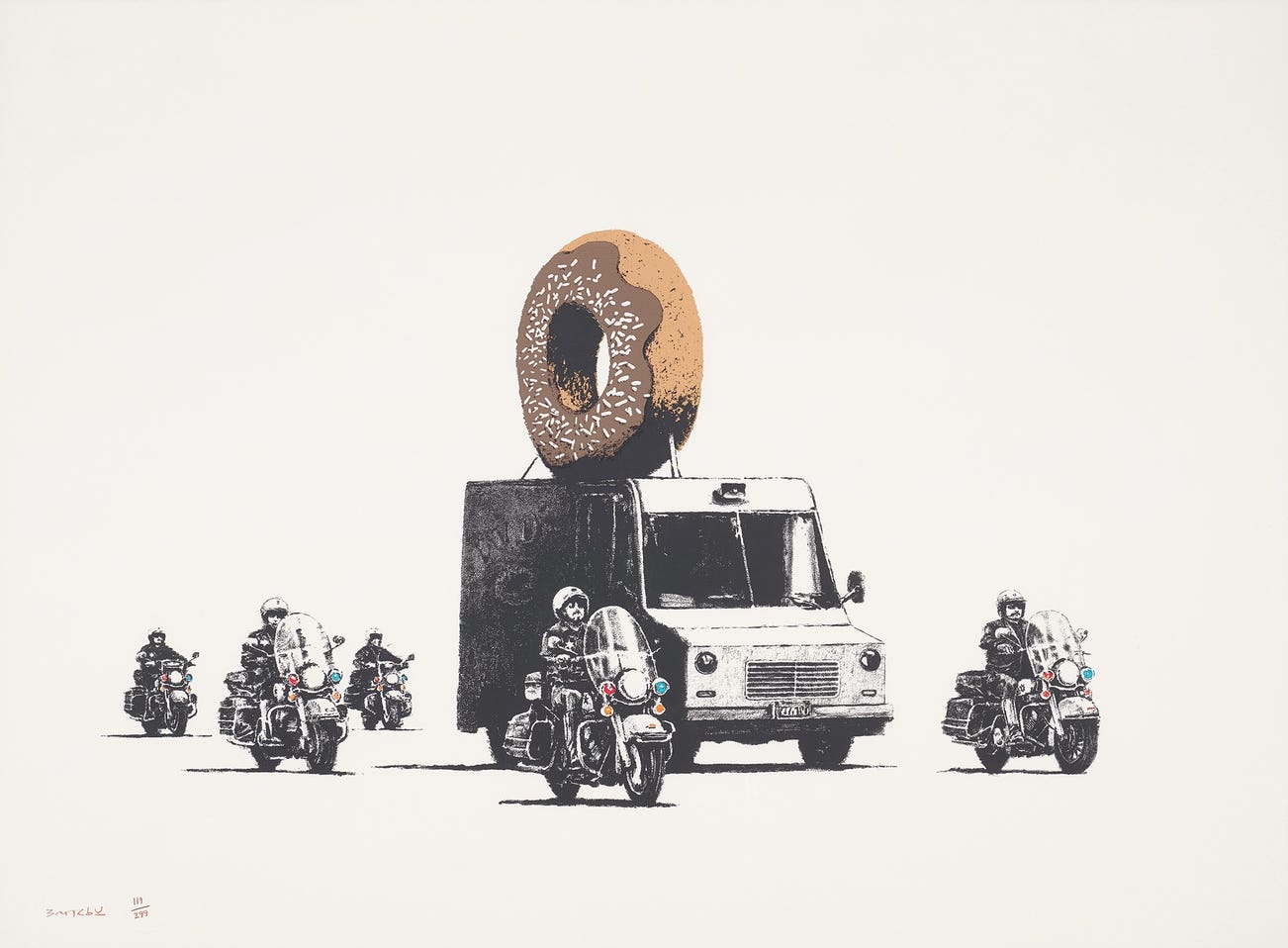 His graffiti, paintings and screenprints use whimsy and humour to satirically critique war, capitalism, hypocrisy and greed — with not even the Royal family safe from his anti-establishment wit.