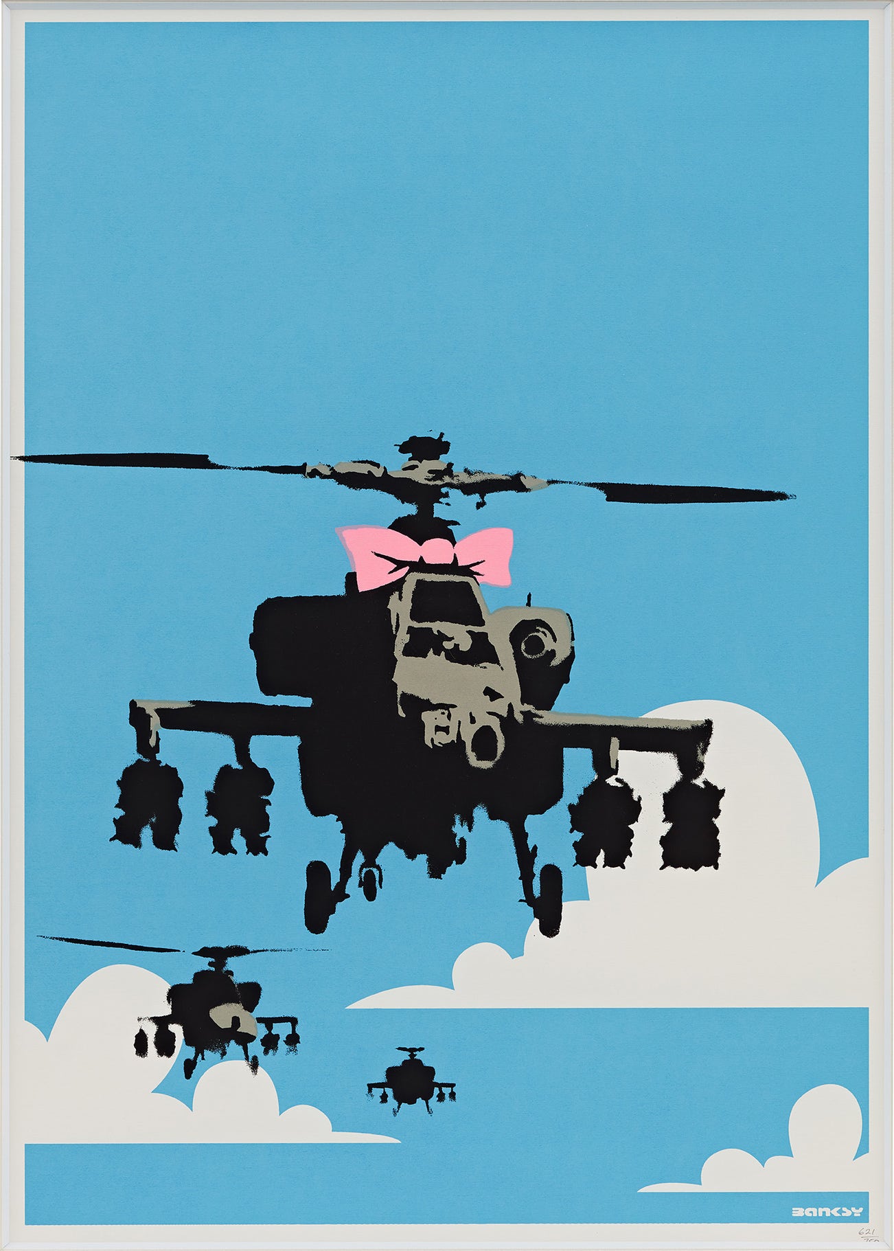 His graffiti, paintings and screenprints use whimsy and humour to satirically critique war, capitalism, hypocrisy and greed — with not even the Royal family safe from his anti-establishment wit.
