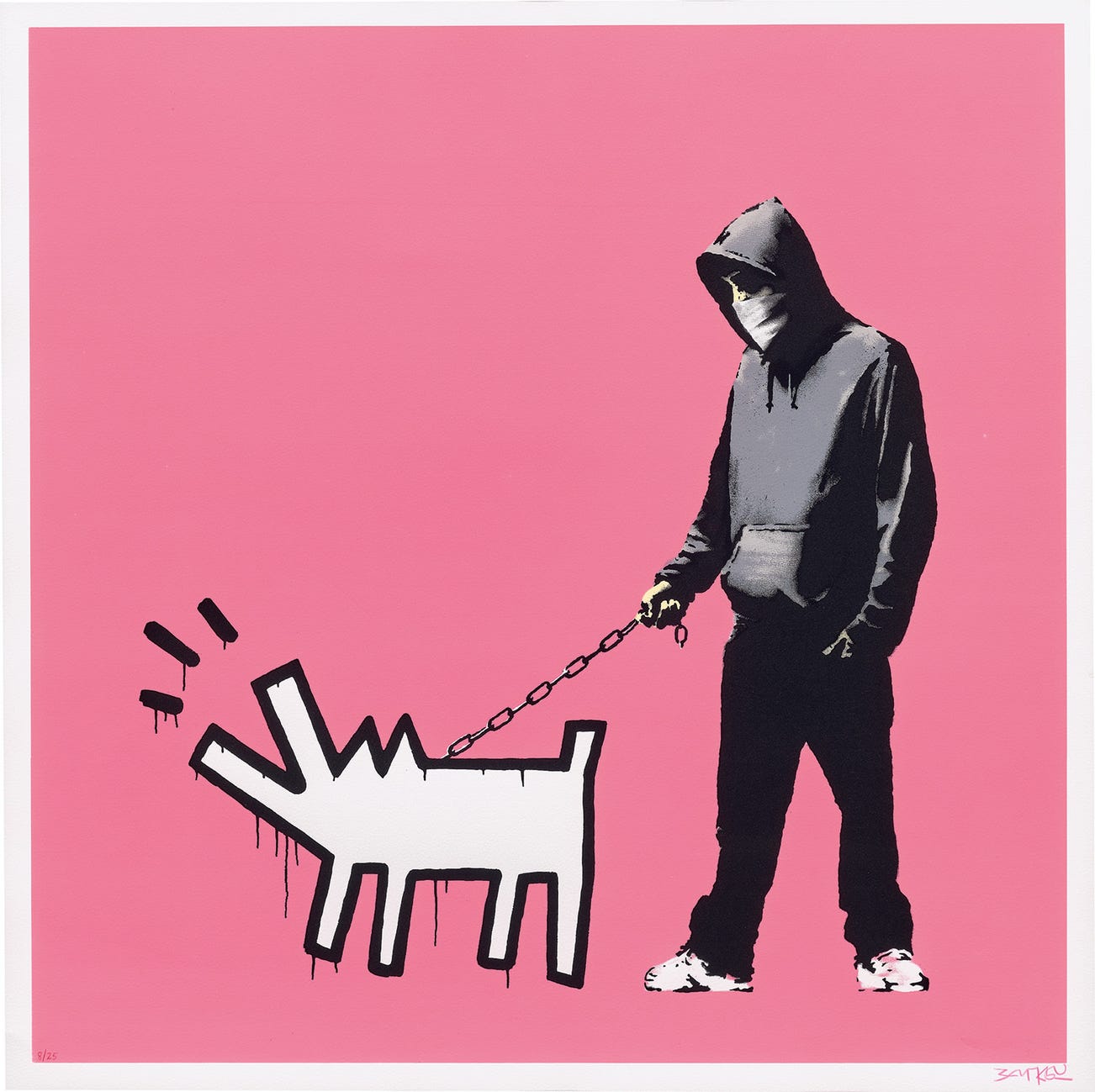 His graffiti, paintings and screenprints use whimsy and humour to satirically critique war, capitalism, hypocrisy and greed — with not even the Royal family safe from his anti-establishment wit.