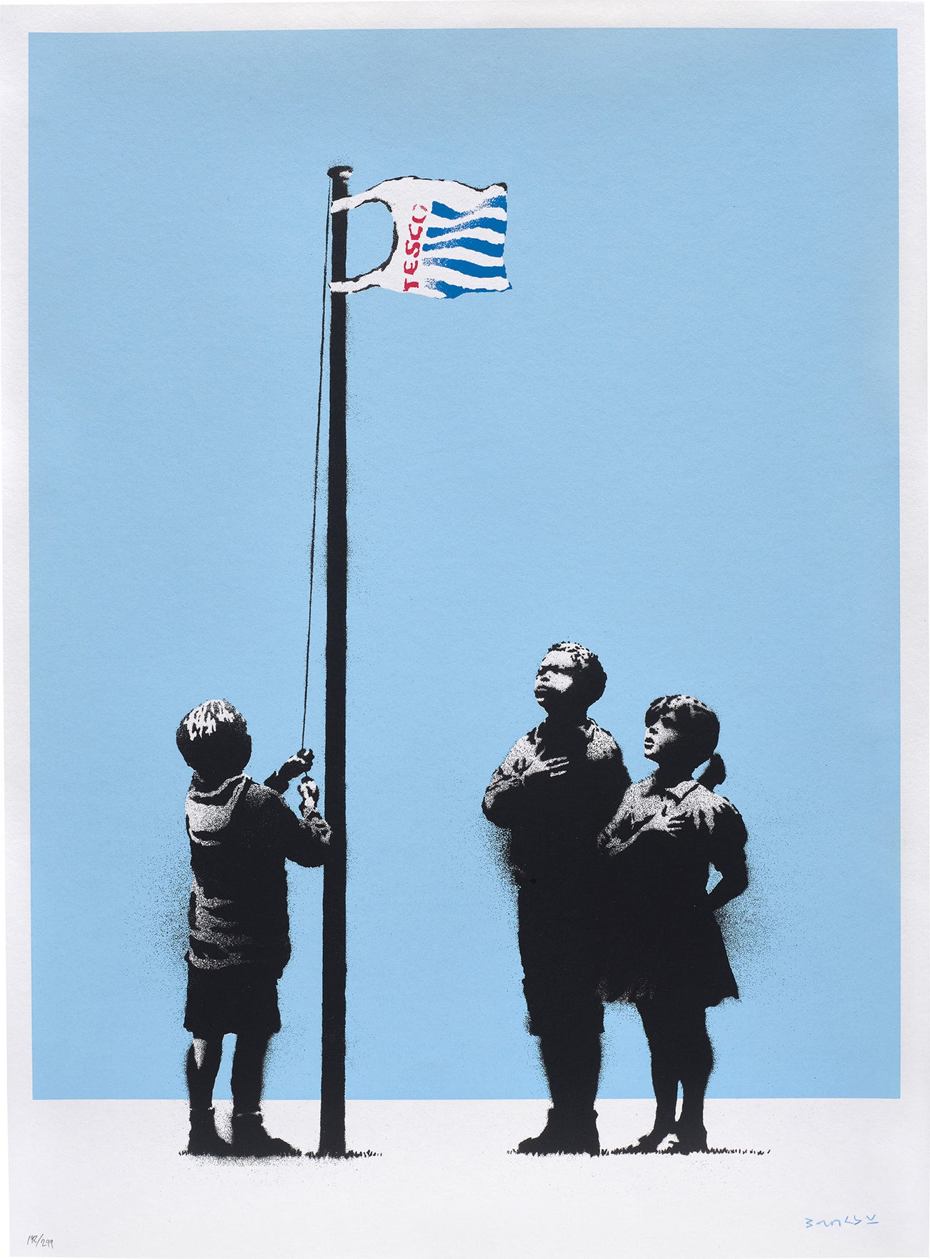 His graffiti, paintings and screenprints use whimsy and humour to satirically critique war, capitalism, hypocrisy and greed — with not even the Royal family safe from his anti-establishment wit.