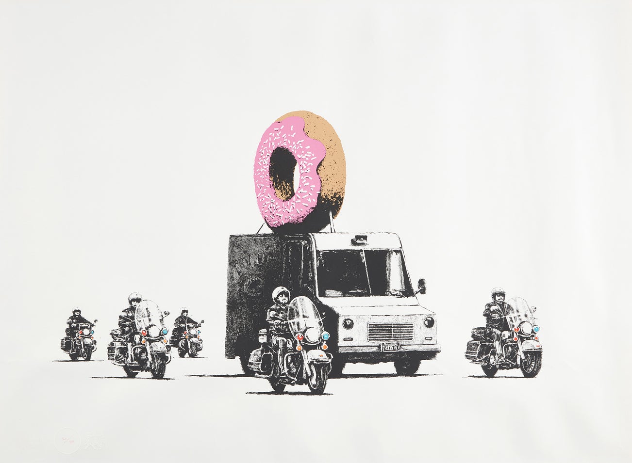 His graffiti, paintings and screenprints use whimsy and humour to satirically critique war, capitalism, hypocrisy and greed — with not even the Royal family safe from his anti-establishment wit.