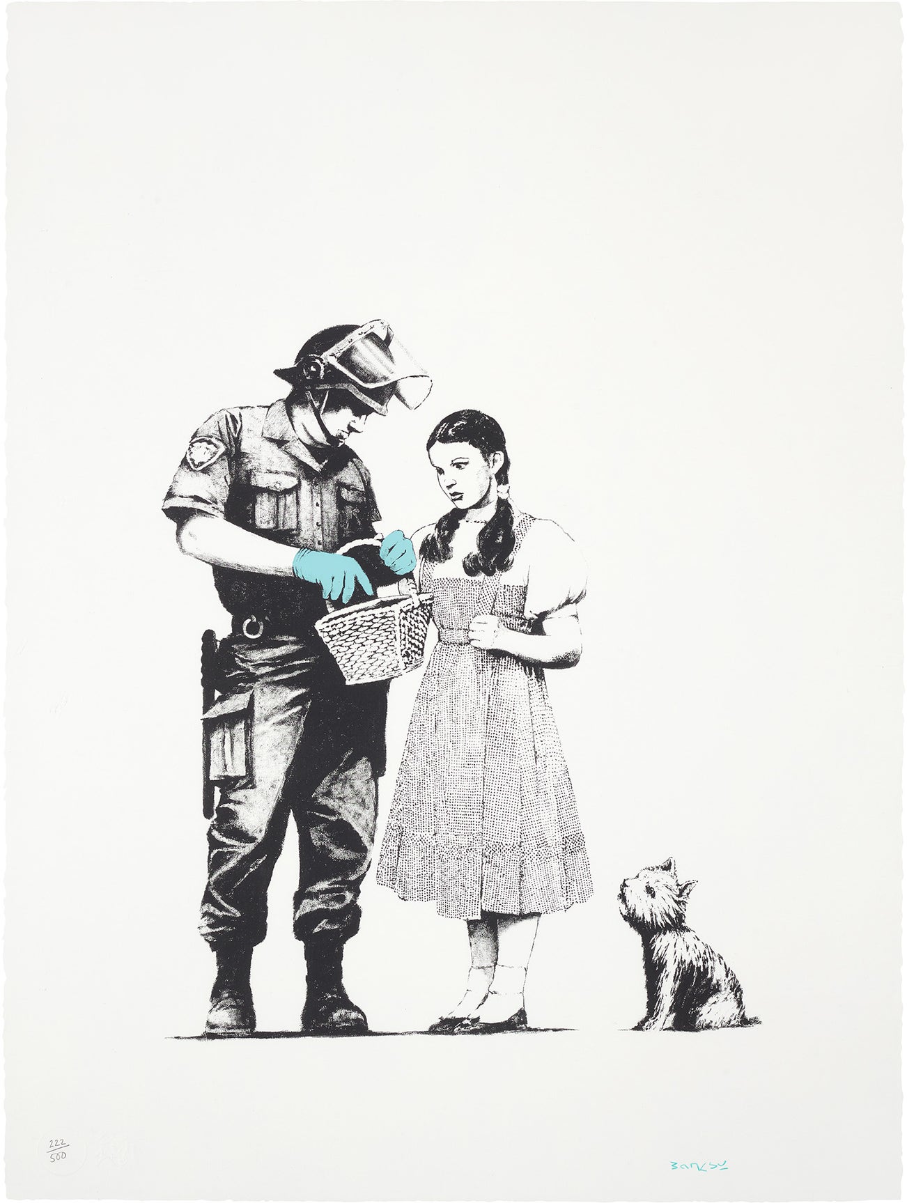 British | 1975Anonymous street artist Banksy first turned to graffiti as a miserable fourteen year old disillusioned with school. Inspired by the thriving graffiti community in his home city, Bristol, Banksy's works began appearing on trains and walls in 1993, and by 2001 his blocky, spray-painted works had cropped up all over the United Kingdom. Typically crafting his images with spray paint and cardboard stencils, Banksy is able to achieve a meticulous level of detail. His aesthetic is clean and instantly readable due to his knack for reducing complex political and social statements to simple visual elements.