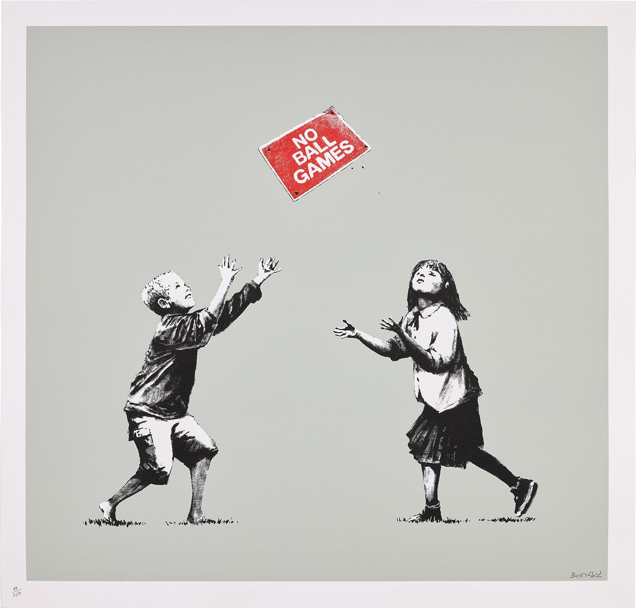 His graffiti, paintings and screenprints use whimsy and humour to satirically critique war, capitalism, hypocrisy and greed — with not even the Royal family safe from his anti-establishment wit.