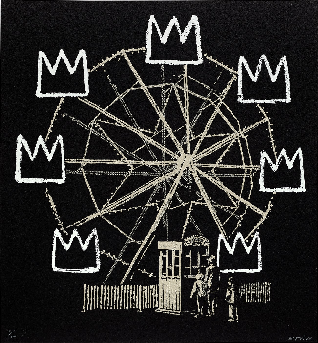 His graffiti, paintings and screenprints use whimsy and humour to satirically critique war, capitalism, hypocrisy and greed — with not even the Royal family safe from his anti-establishment wit.