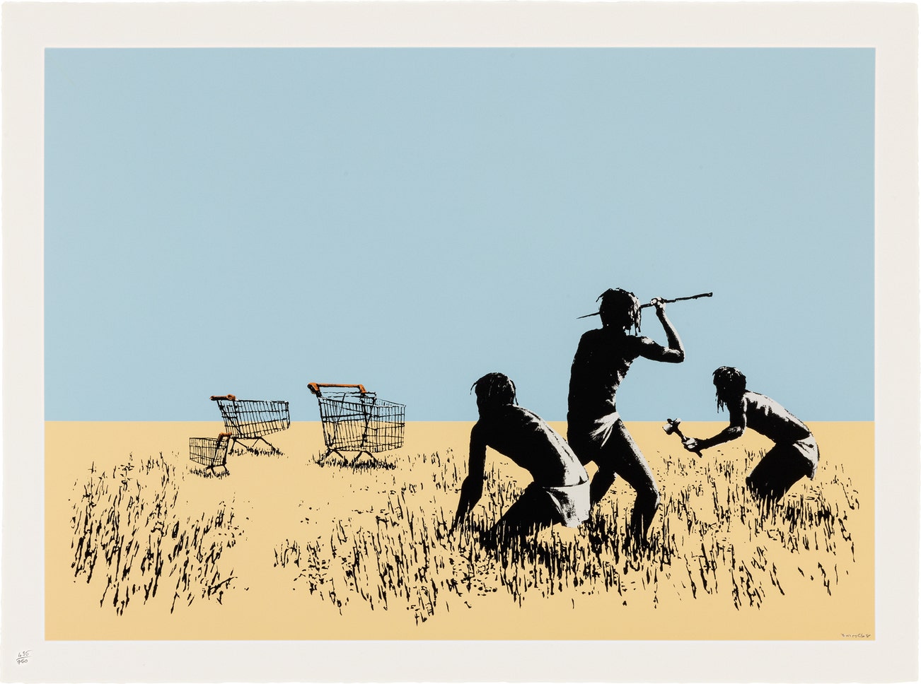 His graffiti, paintings and screenprints use whimsy and humour to satirically critique war, capitalism, hypocrisy and greed — with not even the Royal family safe from his anti-establishment wit.
