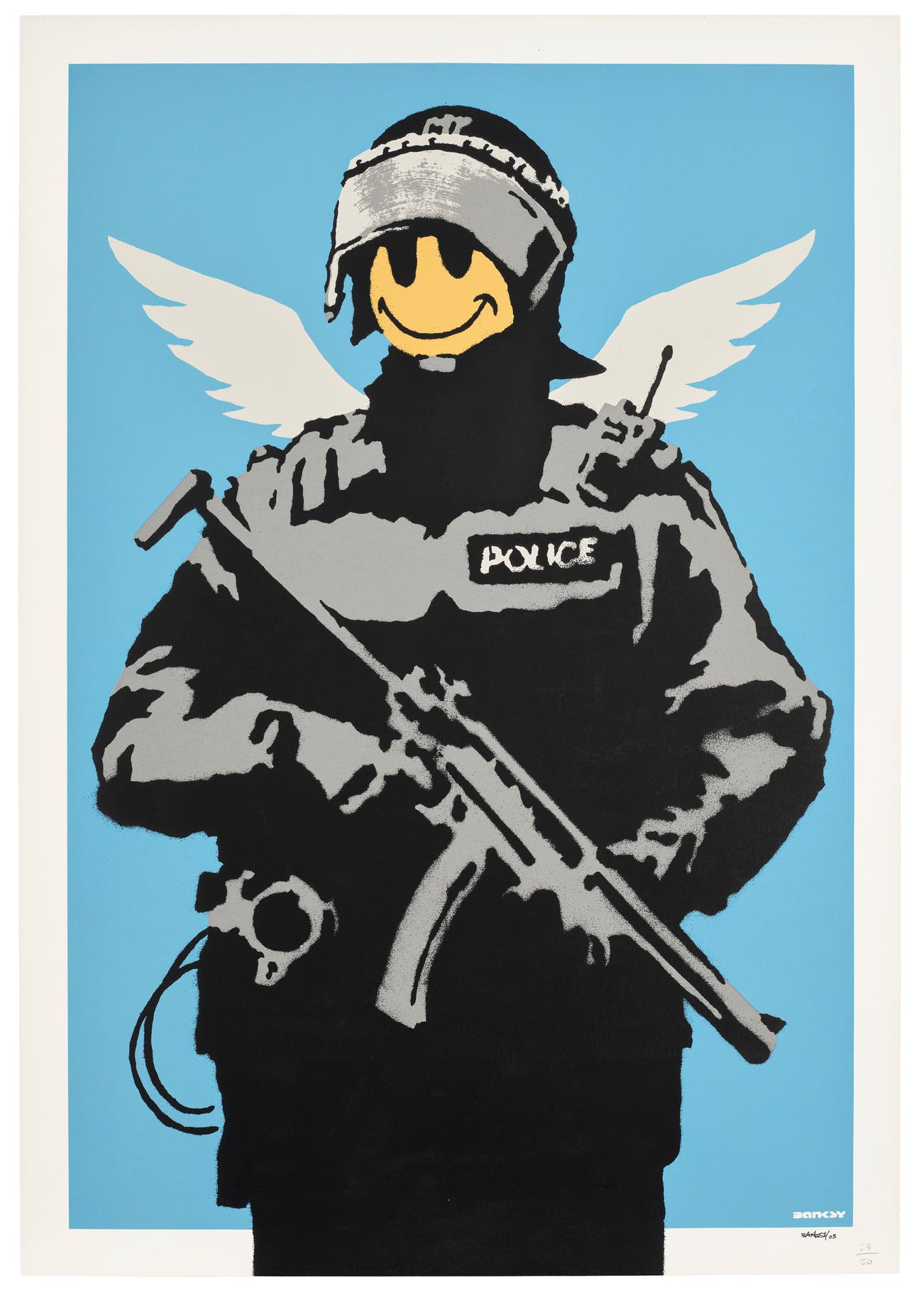 His graffiti, paintings and screenprints use whimsy and humour to satirically critique war, capitalism, hypocrisy and greed — with not even the Royal family safe from his anti-establishment wit.