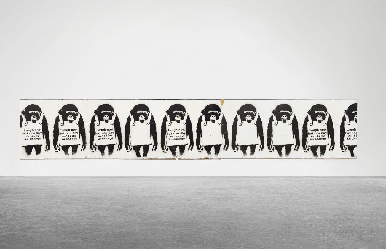 Banksy’s history as a street artist and his eforts to conceal his identity make his artistic fgures his only interactive surrogates. Bearing this in mind, the monkeys upon the panel not only assume an anarchistic quality—promising full revenge upon their rise to power—but also make for a fascinating study into the future of street art. And, as his exhibition spaces shif from urban alleyways to galleries, Banksy paints a fascinating commentary on the current state of contemporary art. Indeed, the art of Banksy was once perceived as nothing more than vandalism with style, yet he is now recognized as the world’s foremost street artist. In terms of his clairvoyance, perhaps no work is more prescient than Laugh Now, 2002.