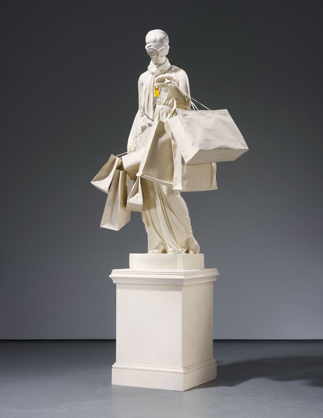 Taking a classical statue from the museum as his model, Banksy mischievously adapts the figure, festooning the statue’s arms with shopping bags and placing a pair of over-sized sunglasses on the face. The effect is both startling and highly amusing. Were it not for her antique drapery, one would be forgiven for seeing this statue as a present day character - a Paris Hilton or Victoria Beckham of sorts.