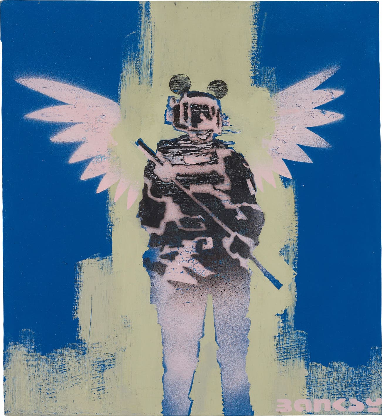 His graffiti, paintings and screenprints use whimsy and humour to satirically critique war, capitalism, hypocrisy and greed — with not even the Royal family safe from his anti-establishment wit.