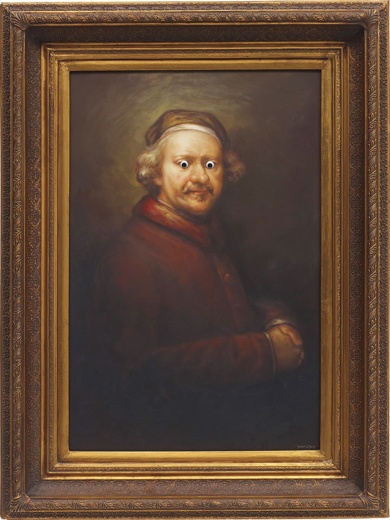 The present lot shows Banksy’s lighthearted attitude as he attaches googly eyes to one of the most famous paintings in art history. Banksy recreates Rembrandt’s well known Self Portrait at the Age of 63 (1669) and covers the expressive eyes, perhaps what Rembrandt’s portraits are best known for, with googly eyes. This simple act undermines the painting itself and encourages the viewer to question the nature of art, creating a piece that is not only witty but visually very amusing. Poignantly, in this case Banksy has altered a work in a similar fashion to his grafti on London’s buildings. However, this practical joke is not without forethought. His appropriation of Rembrandt’s nationally beloved self portrait invites the viewer to question why this act seems so audacious, why this painting is valued so highly and, foremost, what constitutes great art. As a street artist, Banksy is no stranger to graffiti being deemed ‘low art’ or even ‘vandalism’. Consequently, he aims to subvert what we consider ‘high art’ by taking a famous painting, catching the viewer’s interest with attention grabbing googly eyes and creating a piece that is entertaining, thought provoking and progressive.