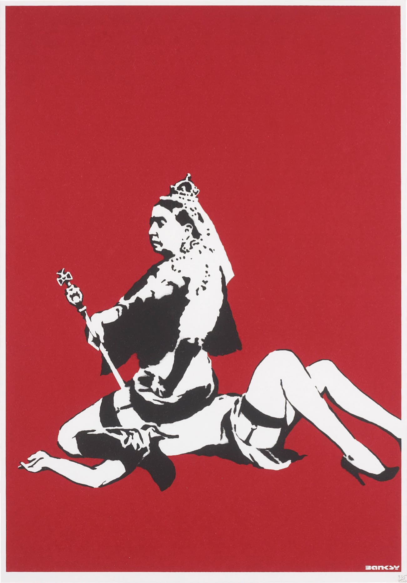 His graffiti, paintings and screenprints use whimsy and humour to satirically critique war, capitalism, hypocrisy and greed — with not even the Royal family safe from his anti-establishment wit.