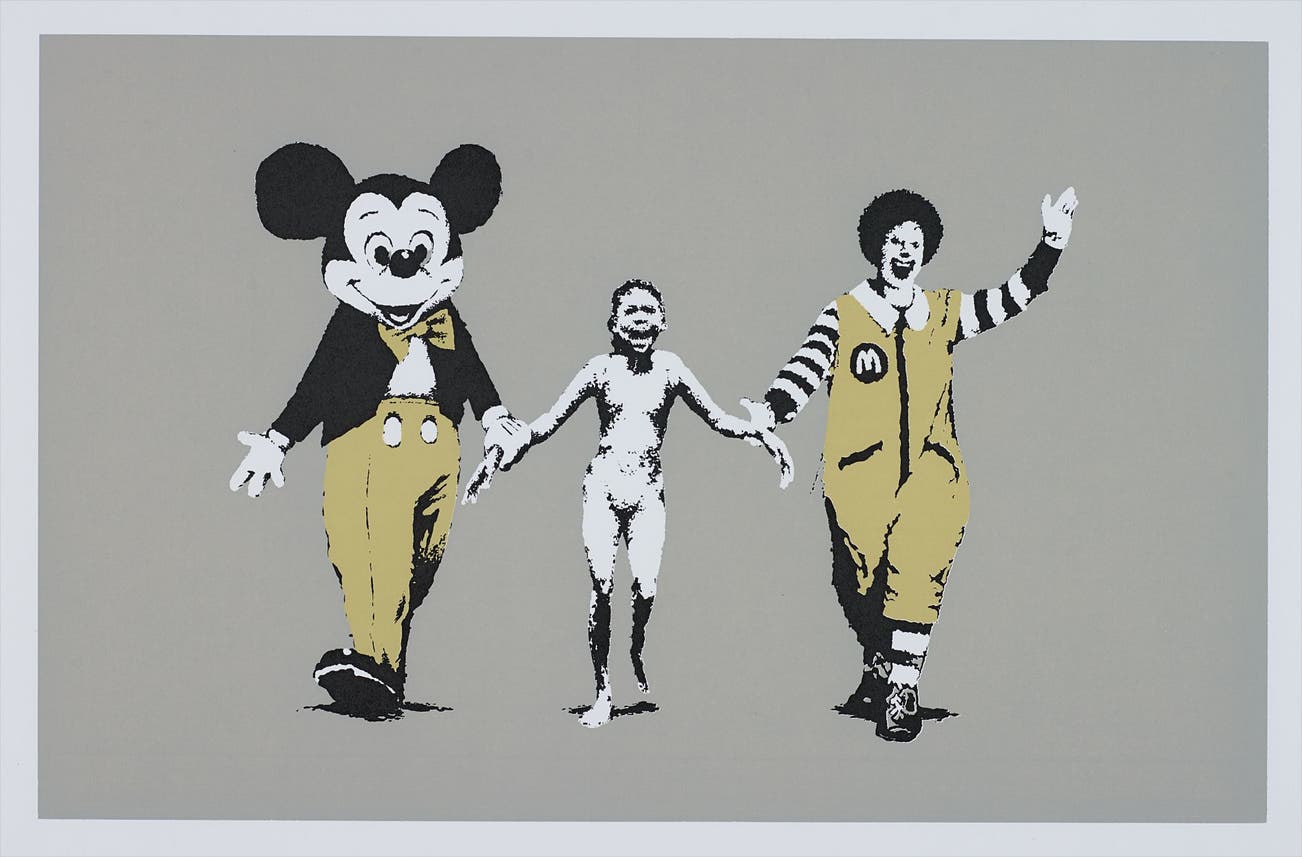 His graffiti, paintings and screenprints use whimsy and humour to satirically critique war, capitalism, hypocrisy and greed — with not even the Royal family safe from his anti-establishment wit.
