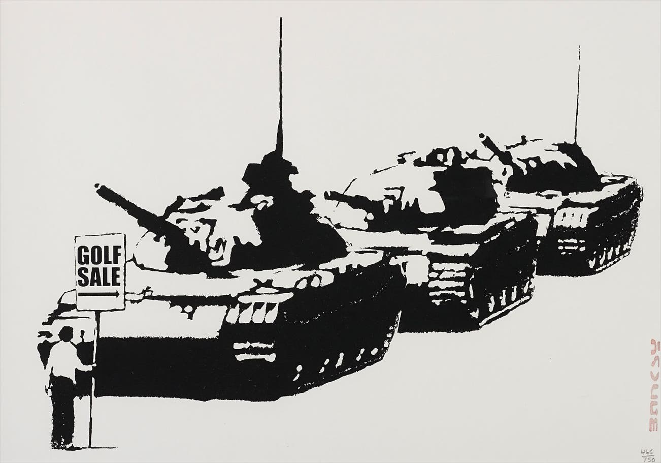 His graffiti, paintings and screenprints use whimsy and humour to satirically critique war, capitalism, hypocrisy and greed — with not even the Royal family safe from his anti-establishment wit.