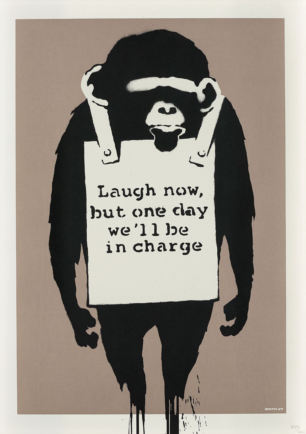 His graffiti, paintings and screenprints use whimsy and humour to satirically critique war, capitalism, hypocrisy and greed — with not even the Royal family safe from his anti-establishment wit.