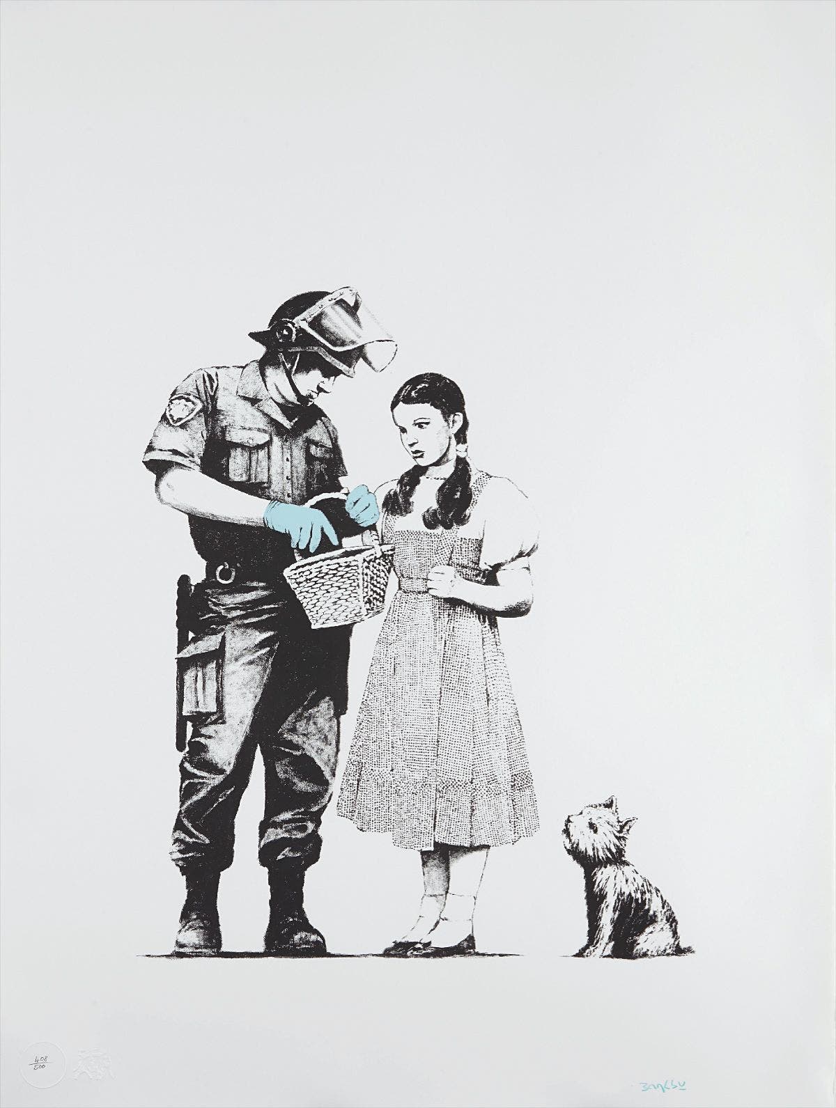 His graffiti, paintings and screenprints use whimsy and humour to satirically critique war, capitalism, hypocrisy and greed — with not even the Royal family safe from his anti-establishment wit.