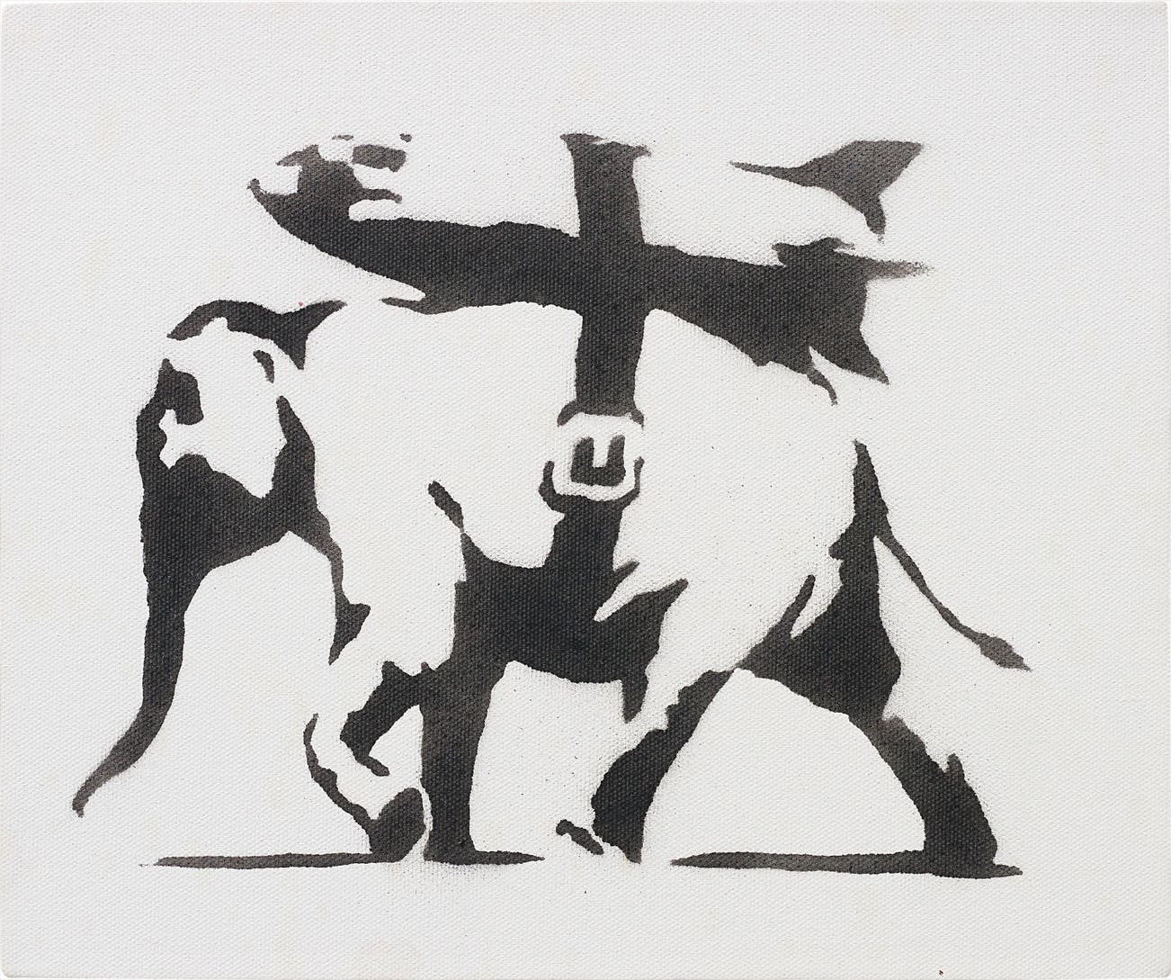 His graffiti, paintings and screenprints use whimsy and humour to satirically critique war, capitalism, hypocrisy and greed — with not even the Royal family safe from his anti-establishment wit.