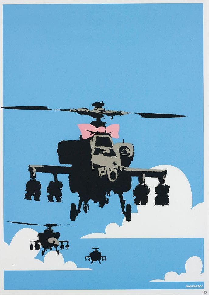 His graffiti, paintings and screenprints use whimsy and humour to satirically critique war, capitalism, hypocrisy and greed — with not even the Royal family safe from his anti-establishment wit.