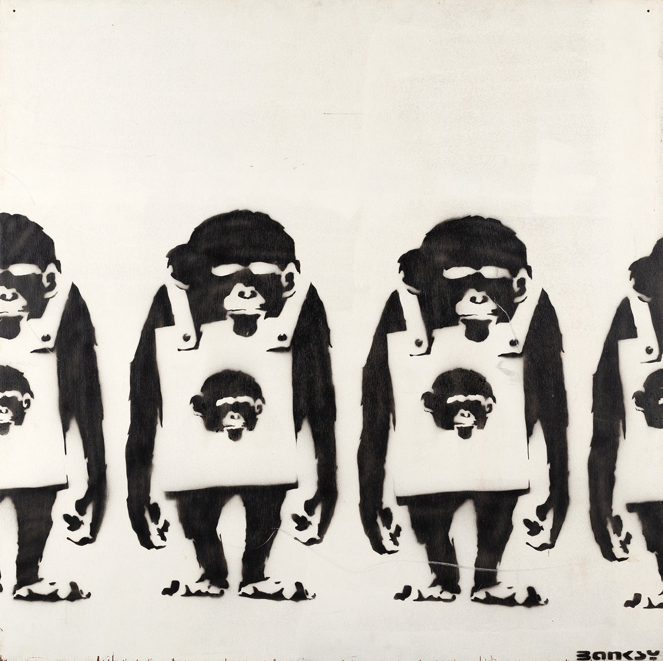 His graffiti, paintings and screenprints use whimsy and humour to satirically critique war, capitalism, hypocrisy and greed — with not even the Royal family safe from his anti-establishment wit.