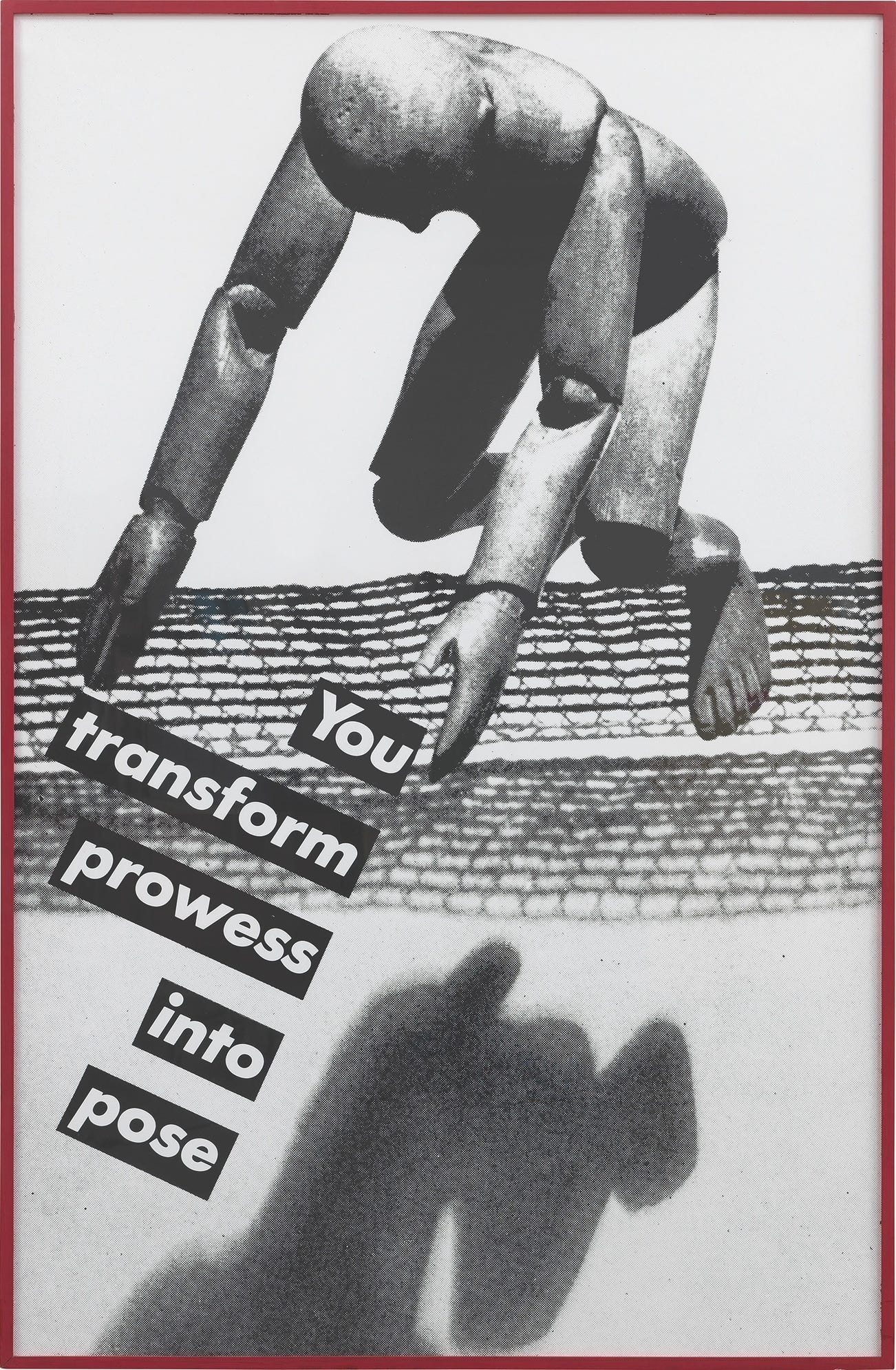 Untitled (You Transform Prowess into Pose), is a potent and engaging example of Barbara Kruger’s unparalleled interrogation of socio-political power constructs, identity, gender and sexuality. Characteristically interfering with her compositional ground, a black and white photographic image, the artist intrusively pastes text stated in Helvetica Ultra Condensed text or white-on-red Futura Bold Oblique over the graphic. Kruger's art and dicta was central to the Pictures Generation, the group of artists who used appropriation to unveil the false nature of images within the proliferation of visual culture in the 1970s. Translating social and political statements into sharp catchphrases Kruger’s work seizes the viewer’s attention, and compels them to take action.