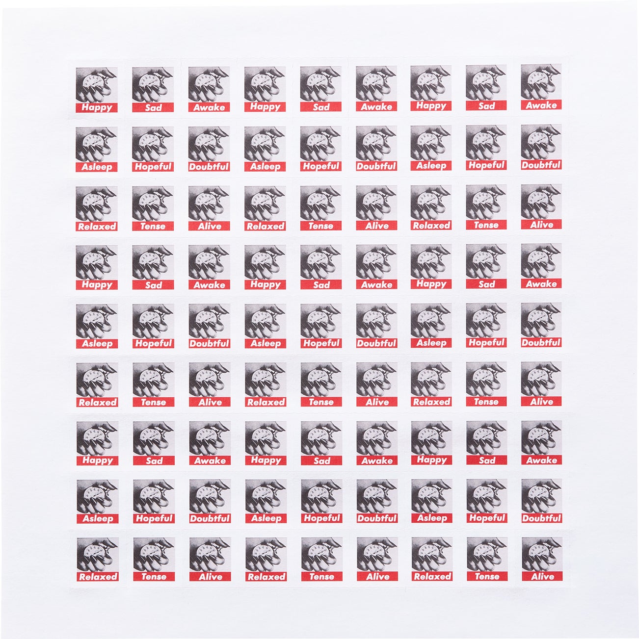 "A variation on an earlier work from 1990, this set of 81 postage stamp–sized images is printed on kiss cut adhesive paper (peel and stick). The nine individual images, which repeat in a grid of 3 x 3, read: Happy, Sad, Awake, Asleep, Hopeful, Doubtful, Relaxed, Tense, Alive." - East of Borneo Editions, Los Angeles