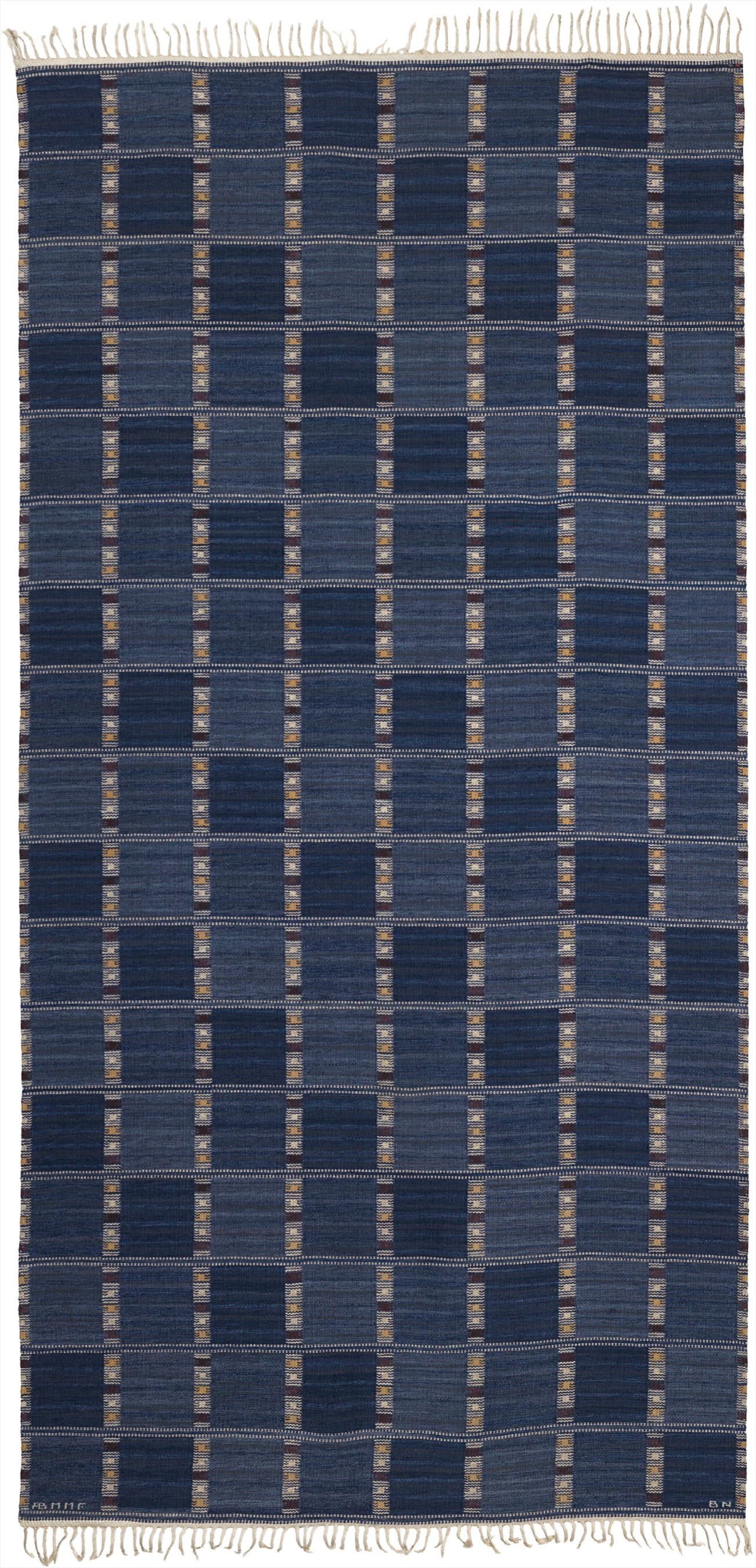 Produced by Märta Måås-Fjetterström AB, Båstad, Sweden, woven by Berta Nylander and Ingegärd Johansson. Woven with manufacturer’s mark AB MMF and artist’s initials BN.