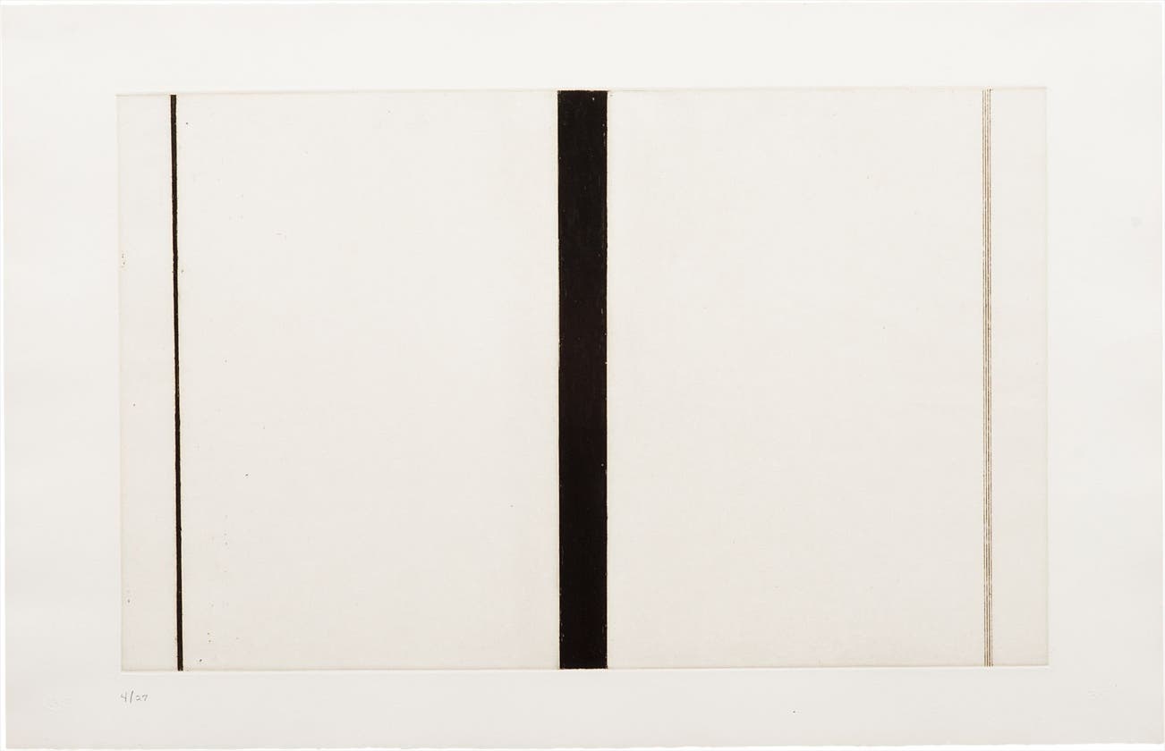 Toward the end of his life the plastic handling of the zips became increasingly austere until, in this print, the edges of the black strips have a uniformity that evokes the monumental and peaceful.This etching was one of two compositions Newman completed shortly before his death. He had been asked to make a memorial print for Martin Luther King, and before executing it he experimented with the etching techniques. This stark image, its intensely black, aquatinted, vertical stripe subjected to the unequal division of a white field cut into by narrow etched lines, is probably the basis for the totally black memorial aquatint that remained unprinted at Newman’s death. Riva Castleman, Modern Art in Prints, The Museum of Modern Art, New York, 1973, p. 47.