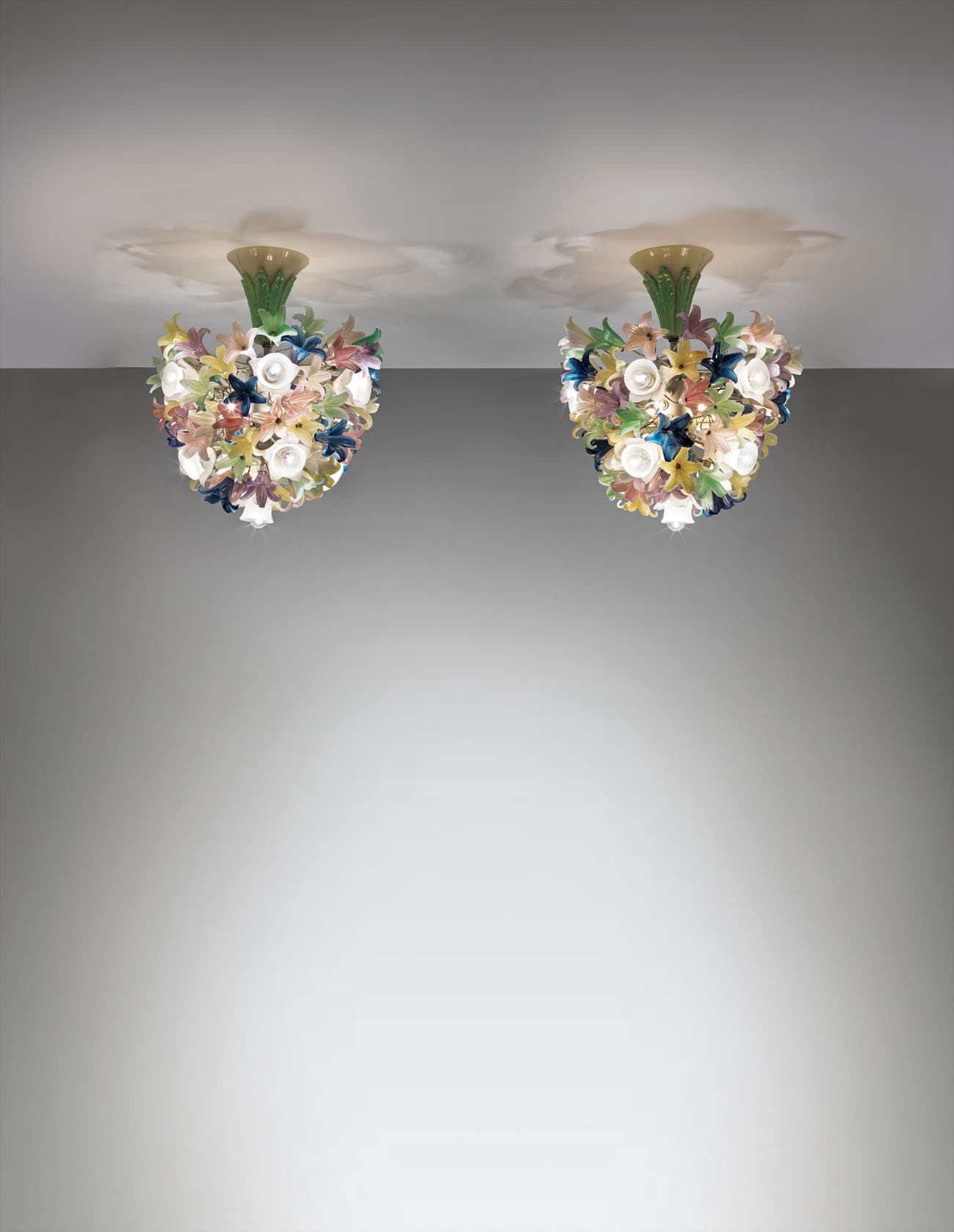 Colored glass paste with gold leaf inclusions, painted metal, brass, aluminum.