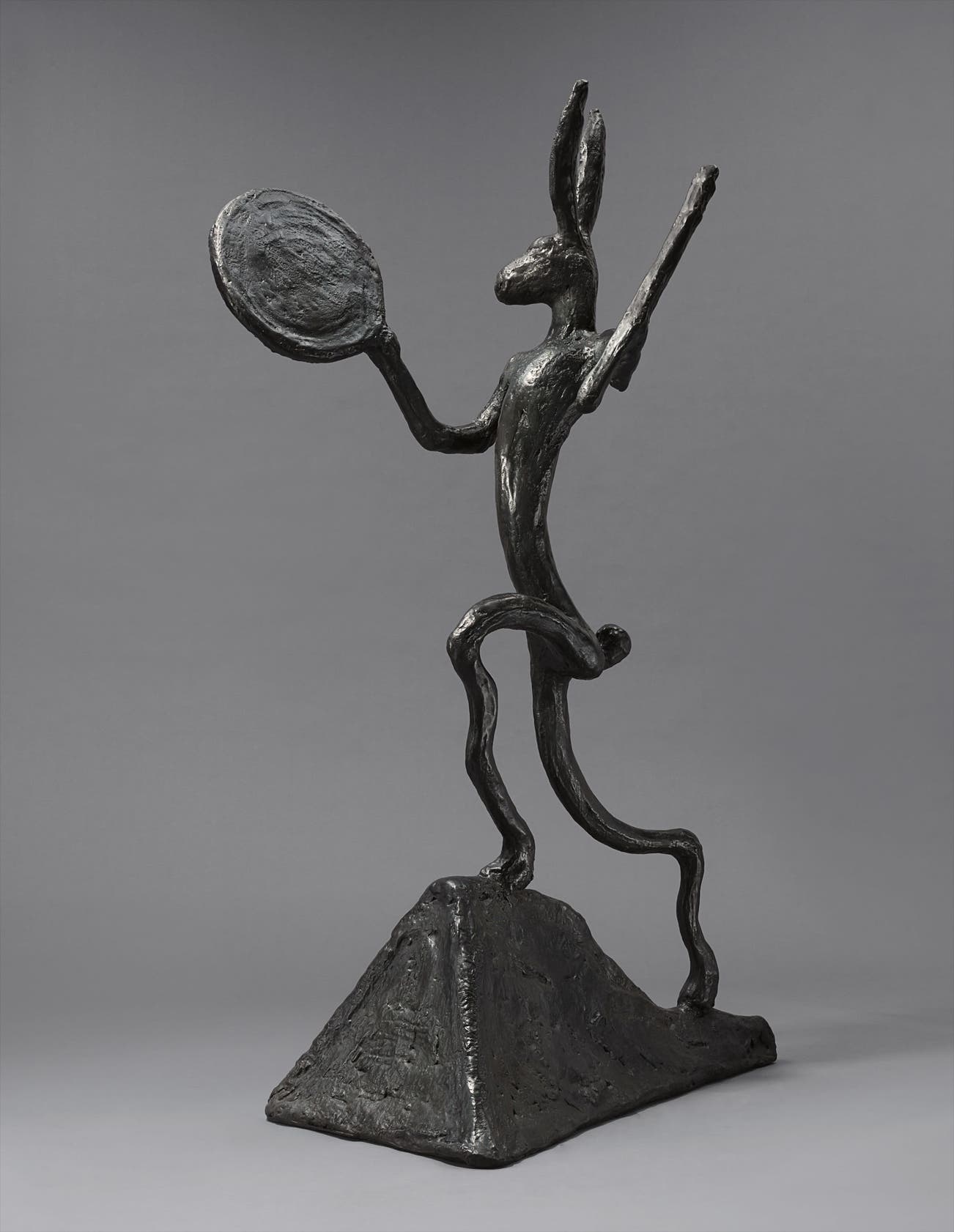 Barry Flanagan’s work has been recognised throughout the world as two-fold in its profundity. The first part lies in his ingenious ability to summon joy from the sober material of cast bronze, rendering powerless any oxidisation through the sheer joie de vivre of his subjects. But almost paradoxically, Flanagan’s work inspires profound contemplation, as the hero of his later three decades of work, the hare, has influenced a wealth of symbolic, historical, and altogether cultural exploration of its meaning and presence in art. Left Handed Drummer, 1997, is one of the most important examples of Flanagan’s mature work and an emblematic portrait of his spirited protagonist, presenting us with an uproarious figure as serious as it is determined to please.