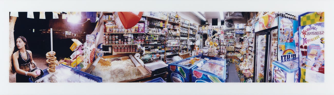 The sweeping view in Barry Frydlender’s Pitzutziya is replete with poignant metaphors that address the history of photography, the construction of a national identity and the digital matrix underlying reality in the 21st-century. The image presents an exaggeratedly elongated interior view of a convenience store, commonly referred to as a ‘pitzutziya’ in Frydlender’s native Israel. The hyper-accentuated horizontality of the image implies both a divergence from reality as well as a cinematic reel. The allusion to the latter genre is not coincidental, for Pitzutziya is constructed of dozens of images taken by Frydlender with a handheld 35mm camera and later edited and spliced together over a period of months. The resulting image is a strong counter argument against the historical claims that the field of photography is inevitably tethered to reality. Also, by piecing together an artificial visual tapestry, Frydlender presents an image that is purposeful in its dual and simultaneous ability to disorient and lure, straddling a fine line between familiarity and fantasy.