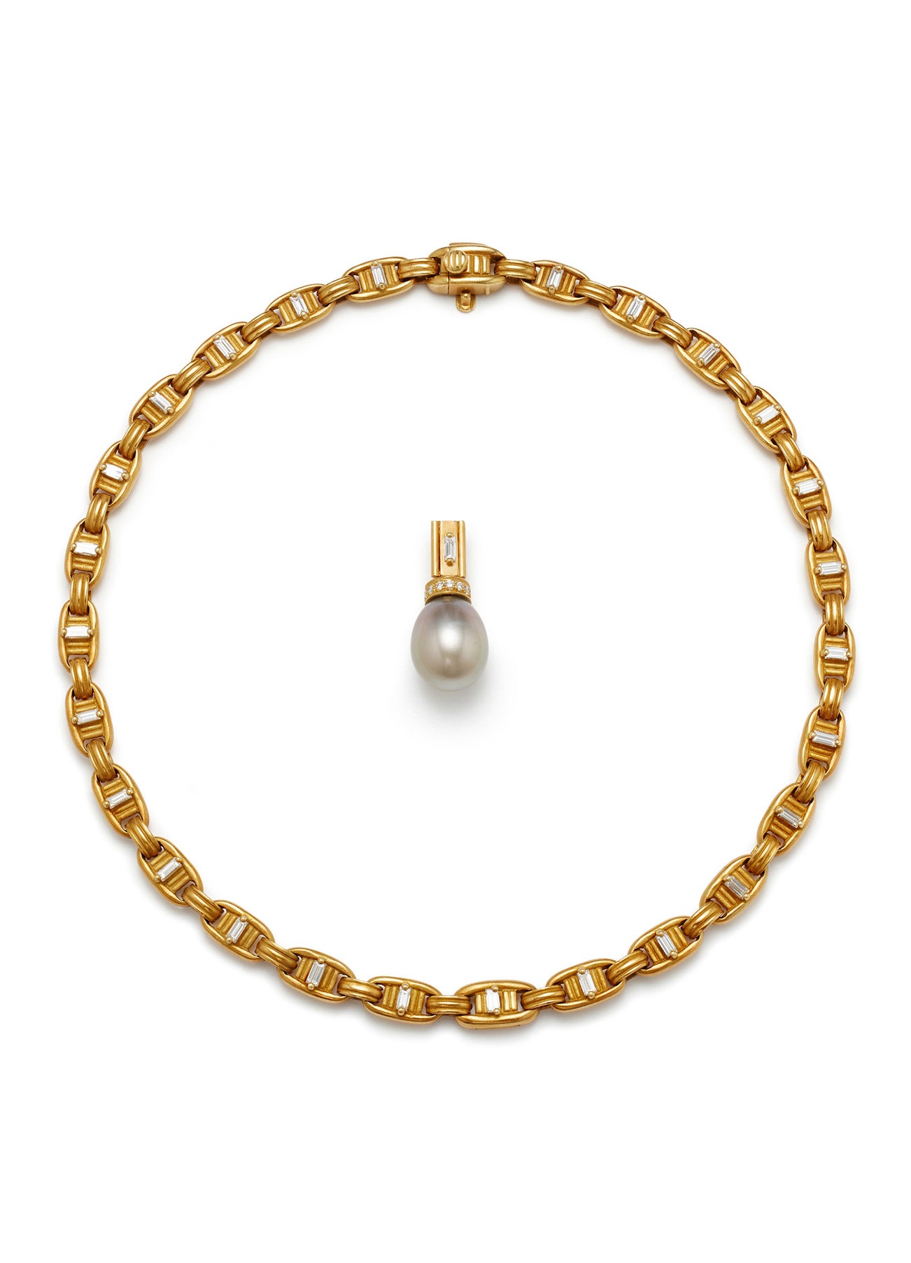 A Gold, Diamond and Cultured Pearl Pendant Necklace