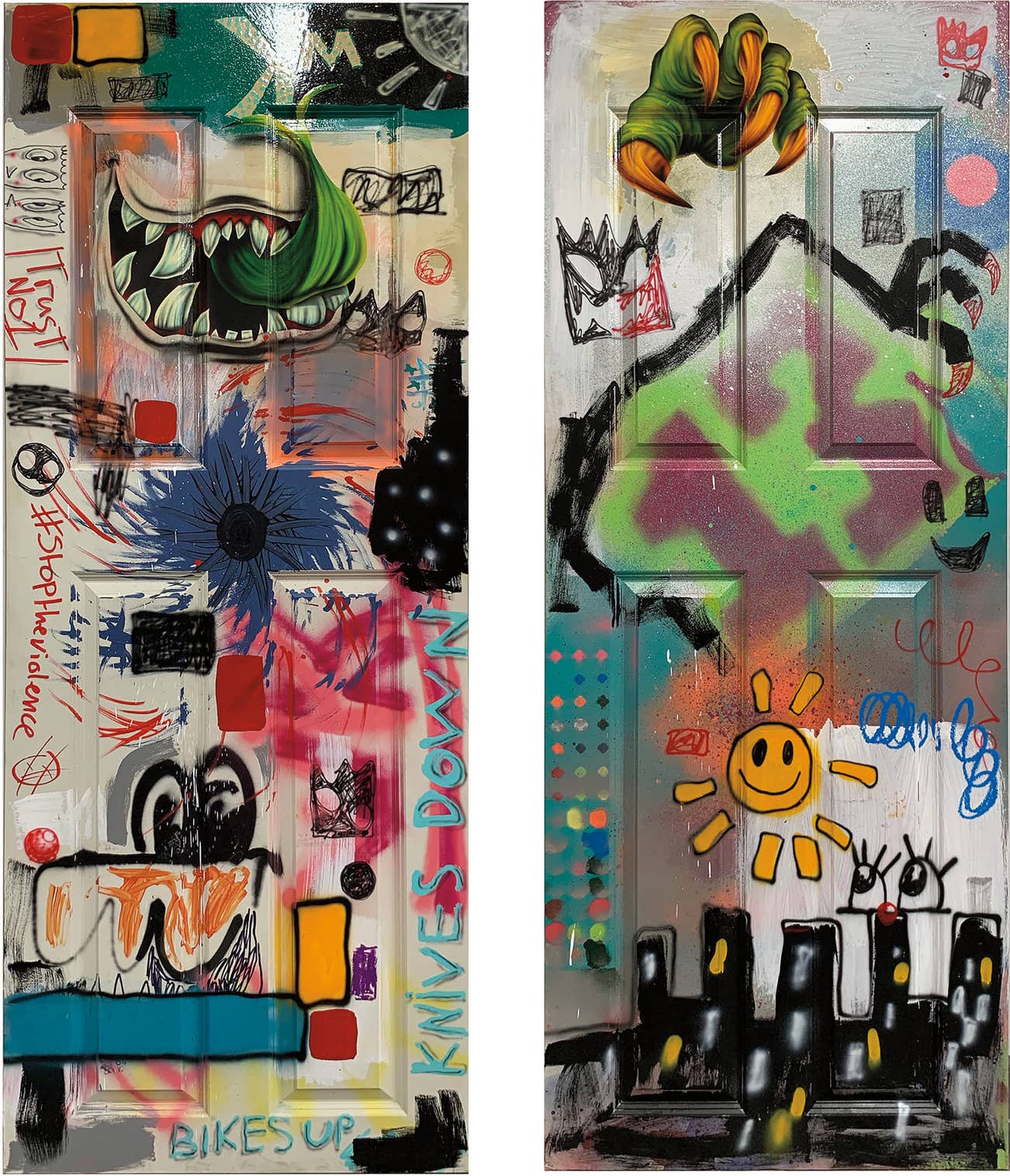 each enamel paint, metallic enamel paint, varnished paper collage, household paint, pen, coloured pencil and oil pastel on wooden door with wooden struts