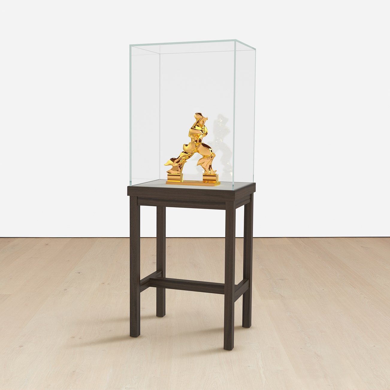 mirror-polished 24K gold on nickel on copper on SLA rapid prototype model and solid brass with stainless steel armature, fittings and resin filling in the artist's walnut, ColorCore, aluminum and low-iron glass table pedestal and vitrine