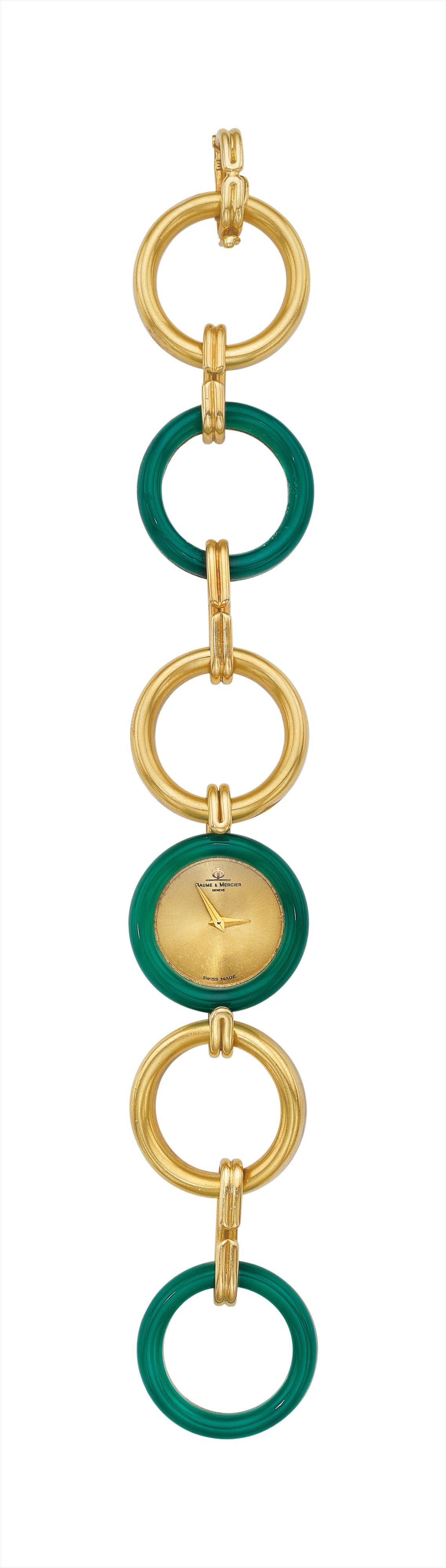 Of quartz movement, the circular gold dial with gold hands within a carved chrysoprase bezel, to the similarly designed alternating chrysoprase and polished gold link band, mounted in 18K yellow gold, length 7 7/8 inches.