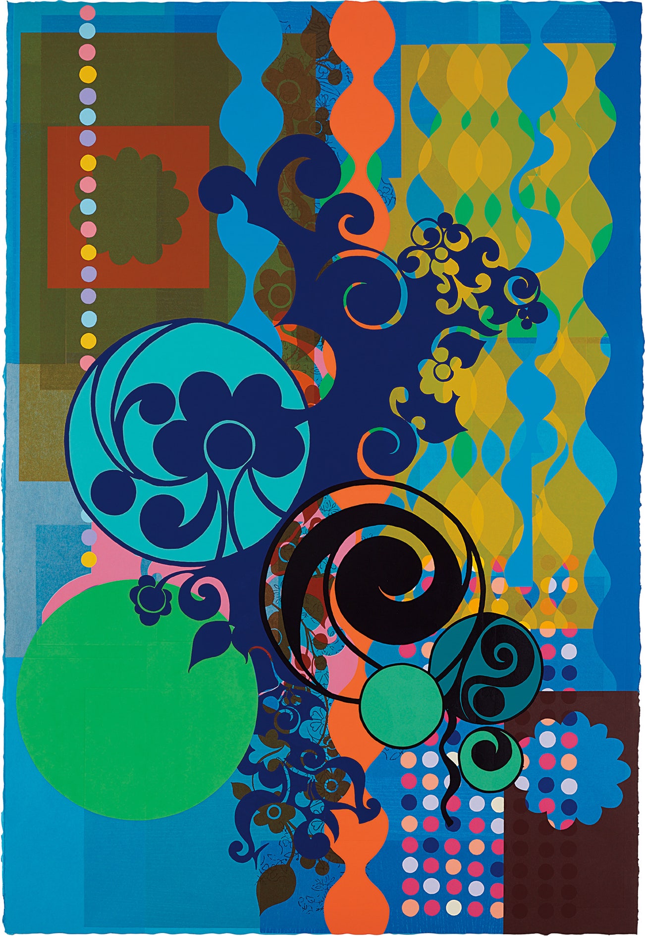 Screenprint and woodcut in colors, on heavy Hiromi handmade Kozo paper, the full sheet.