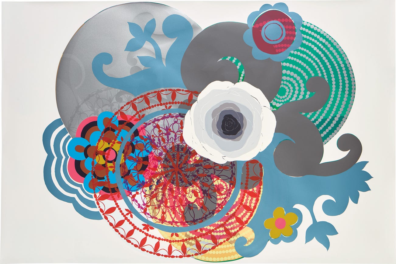 Brazilian | 1960Beatriz Milhazes is best known for her vibrantly colored yet calculated compositions. The artist has cited Baroque architecture, lace work, Carnival decoration and the flora of the Jardim Botanico in Rio de Janiero chief among her inspirations. Milhazes' artistic practice is akin to monotype or collage in that the artist first paints motifs directly onto transparent plastic sheets and later applies them to the canvas, leaving the plastic to dry. The superimposed image allows for overlapping and layering, resulting in a textured canvas and a distorted central focal point. While seemingly chaotic, Milhazes' compositions are perfectly balanced due to the artist's technically sophisticated use of geometric forms and chromatic color palate.