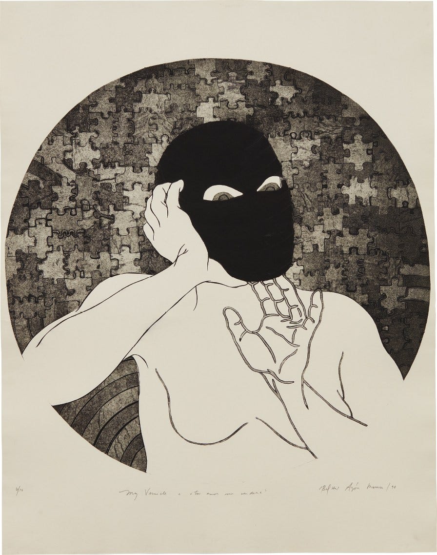 In the present lot, the figure appears to be removing a mask. The word "vernicle" in the title refers to an obsolete term meaning an image of Jesus, yet Ayón has chosen to depict a woman, as she so often does. In the artist's own words, this important print symbolizes "indecision, confusion, of wanting and not wanting, desire and not being able to desire, it is a fight against the mask or façade that as humans we desperately hang on to” (Katia Ayón, ed., Nkame: Belkis Ayón, Madrid, 2010, No. 98.07, p. 21).