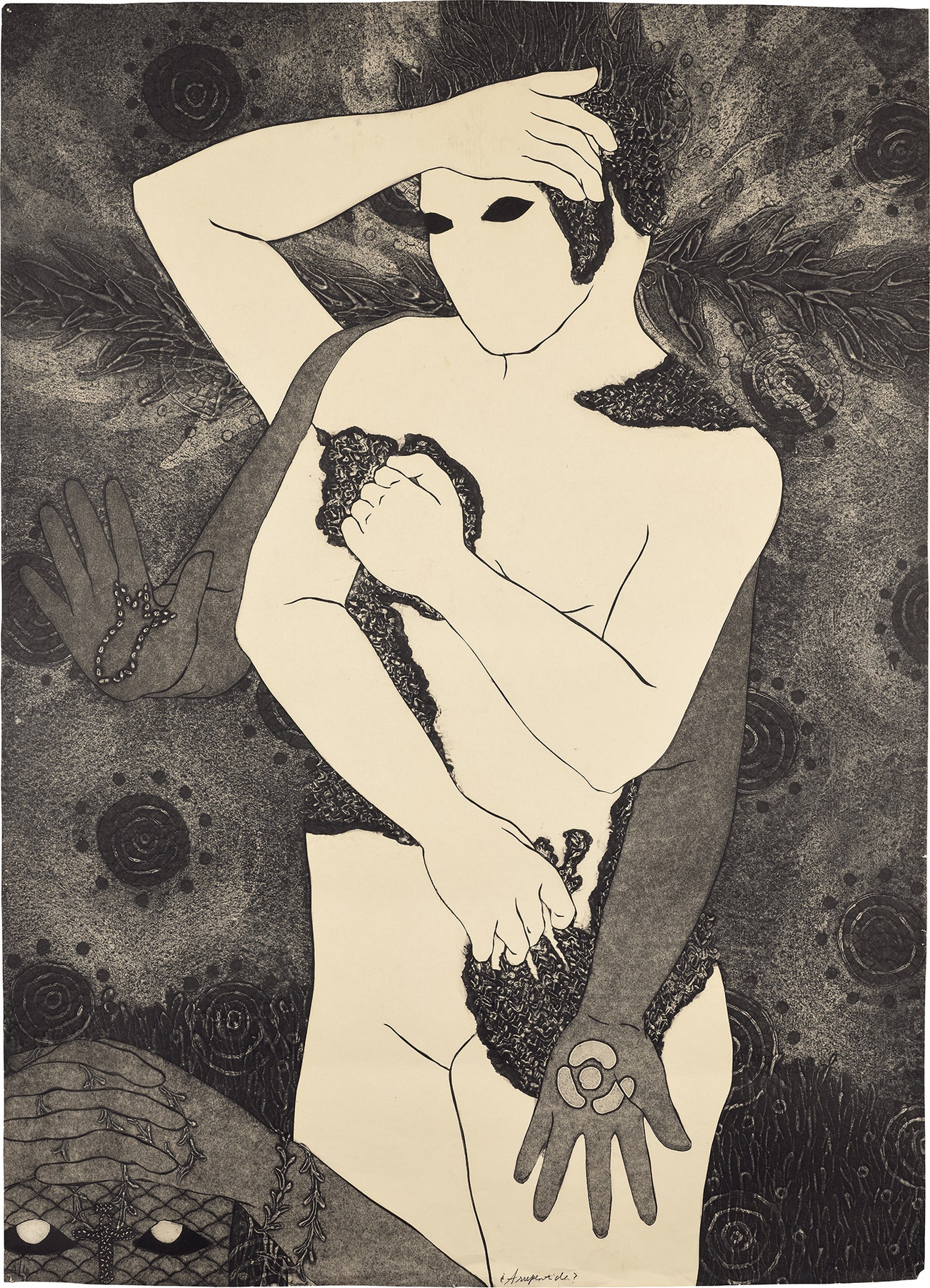 signed, numbered and dated "4/6 ¿Arrepentida? Belkis Ayón 1993" lower edge; titled and inscribed "¿Arrepentida? N. 8 "Haz Que Mi Arrepentimento Sea Sincero"" on the reverse