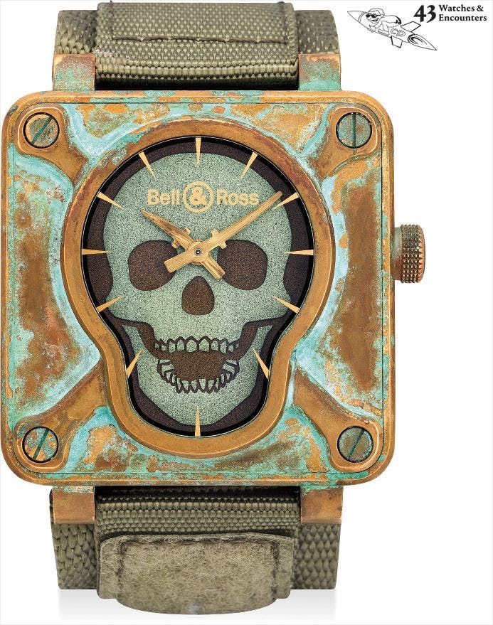 'The case of this BR01 is made from micro-blasted bronze. The alloy of copper and tin is in keeping with watchmaking standards and forces the alloy to turn green, which gives the watch a unique green patina, resulting in a very unique and antique look. The skull and bones bezel takes inspiration from the 18th century pirate emblem.'