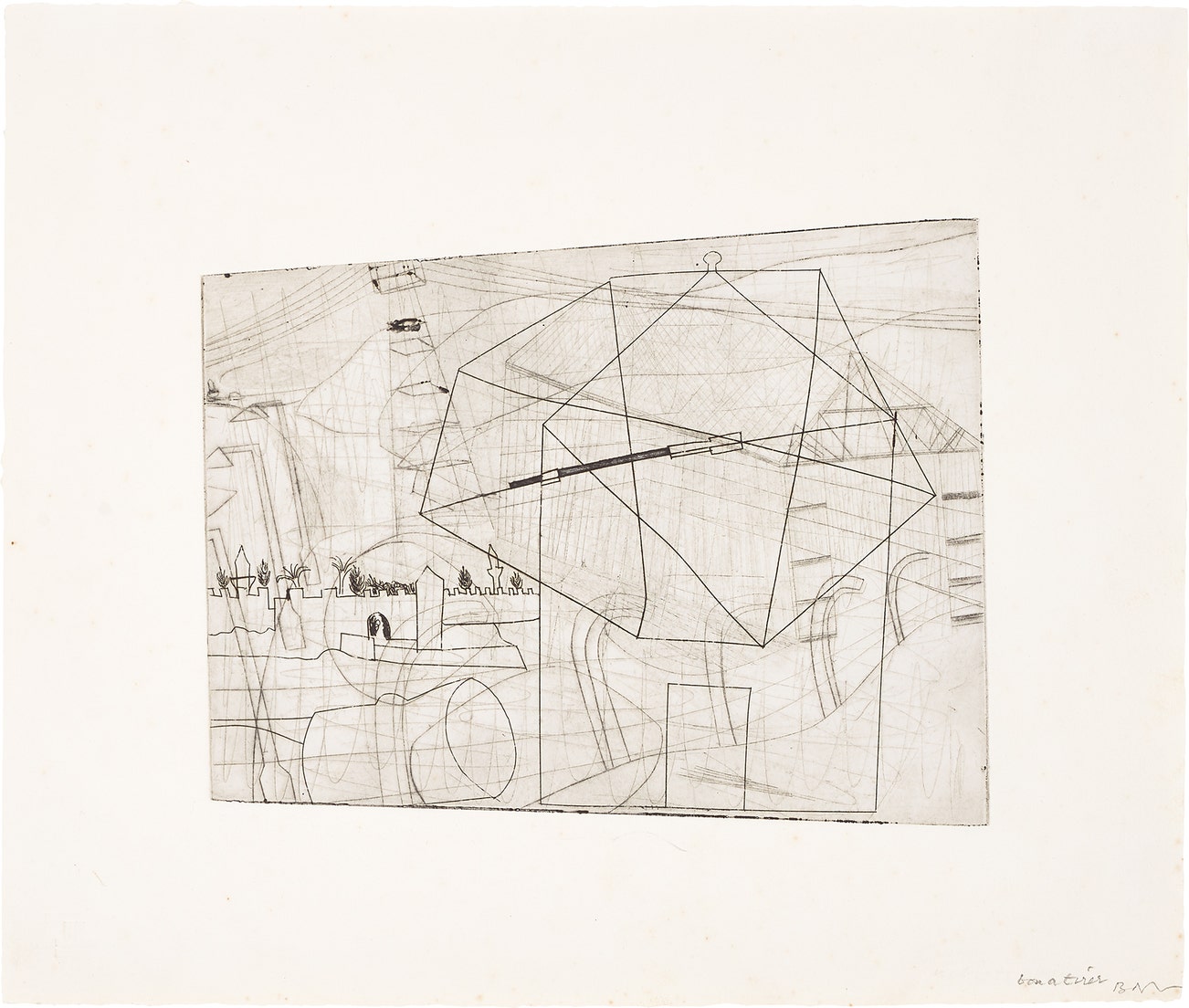 Etching on a used drypoint plate (previously I.C.I. Shed, 1948), on wove paper, with full margins.