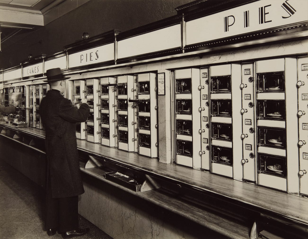 Once a regular feature on the streetscape of Manhattan, Horn & Hardart’s Automats offered freshly-made food via a simple mechanized process. Food items were displayed behind glass and purchased by inserting coins into the adjacent slots, as the figure in Berenice Abbott’s photograph is seen doing. While Horn & Hardart’s flagship Automat was in Times Square, Abbott chose instead to photograph the location at Columbus Circle, according to Abbott authority Bonnie Yochelson, which was a gathering place for musicians and cabaret-goers (Berenice Abbott: Changing New York, p. 376). With their reasonably-priced fare, Automats became increasingly popular in the Depression and spread throughout the city. Yochelson notes that New York City’s last Automat closed in 1991.