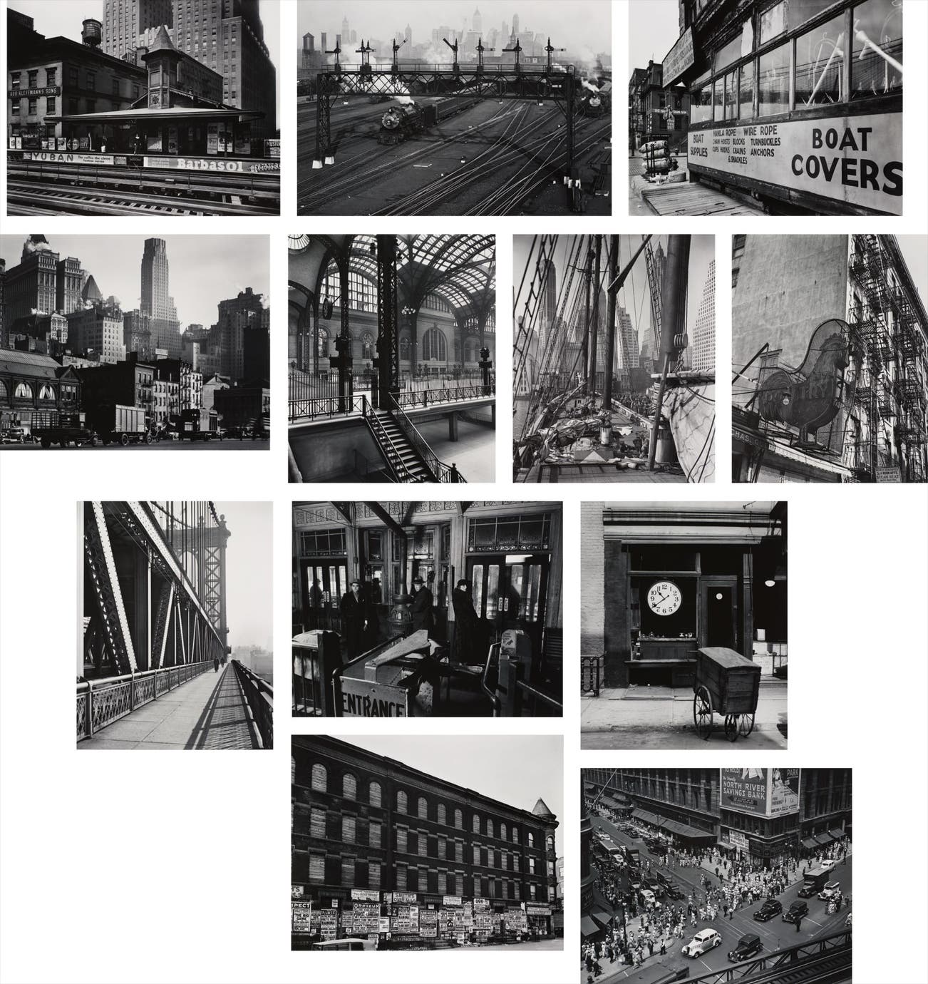 Titles include: Theoline, Pier 11, East River, Manhattan, 1936; Barclay Street Station, New York, 1930; Pennsylvania Station, Manhattan, 1936; West Street, 1936; 4th Avenue Brooklyn Billboards, 1936; 'El' Station Interior, 1936; Marine Shop, c. 1930; Repair Shop, Christopher Street, New York, c. 1947; Macy's Corner, c. 1930; Manhattan Bridge, New York, 1936; Rooster, c. 1936; New Jersey Railroad Yards, 1935.