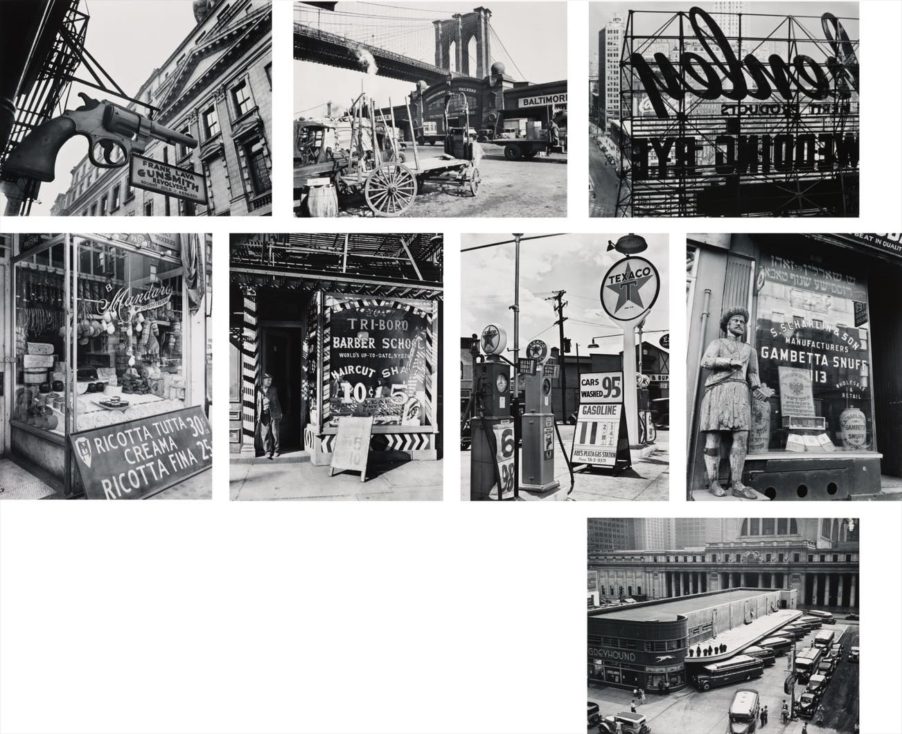 Titles include Gunsmith and Police Department Headquarters, 6 Centre Market Place, February, 1937; Tri-Boro Barber School, 264 Bowery Between East Houston and Price Streets, October 4, 1934; Treasury Building from J. P. Morgan's Office, 1936; Greyhound Bus Terminal, 33rd and 34th Streets Between Seventh and Eighth Avenues, July 14, 1936; Department of Dock's Building, Pier A, May 5, 1936; Cheese Shop, 276 Bleecker Street, February 2, 1937; Rothman's Pawn Shop, 149 Eighth Avenue, May 18, 1938; Snuff Shop, 113 Division Street, January 26, 1938; Columbus Circle, Broadway, Central Park West and 59th Street, February 10, 1936; Gasoline Station, Tremont Avenue and Dock Street, July 2, 1936; Summer Healey Antique Shop, 942 Third Avenue Near 57th Street, October 8, 1936; and Brooklyn Bridge, Pier 21, Pennsylvania Road, March 23, 1937