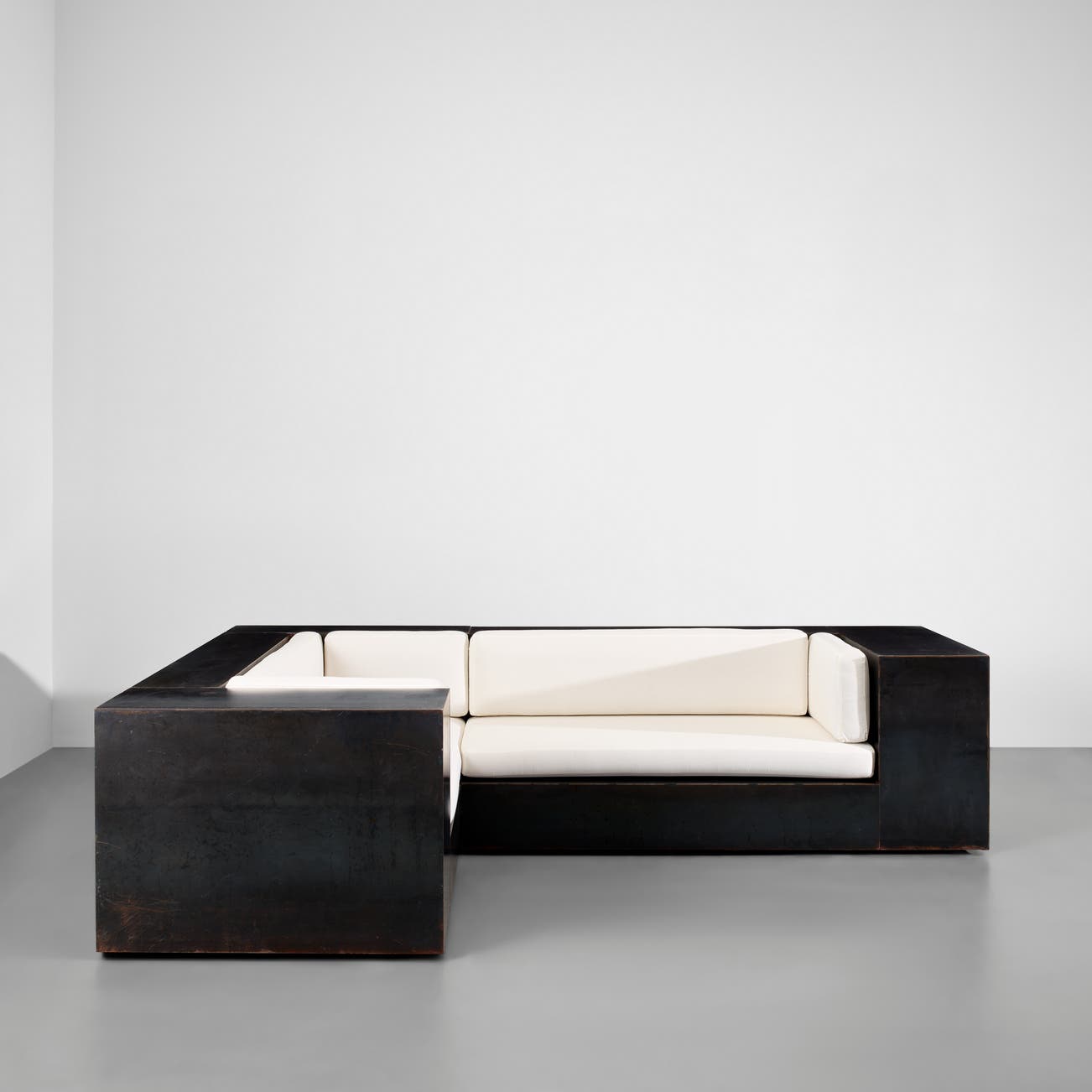Patinated torch-cut and waxed steel, fabric.