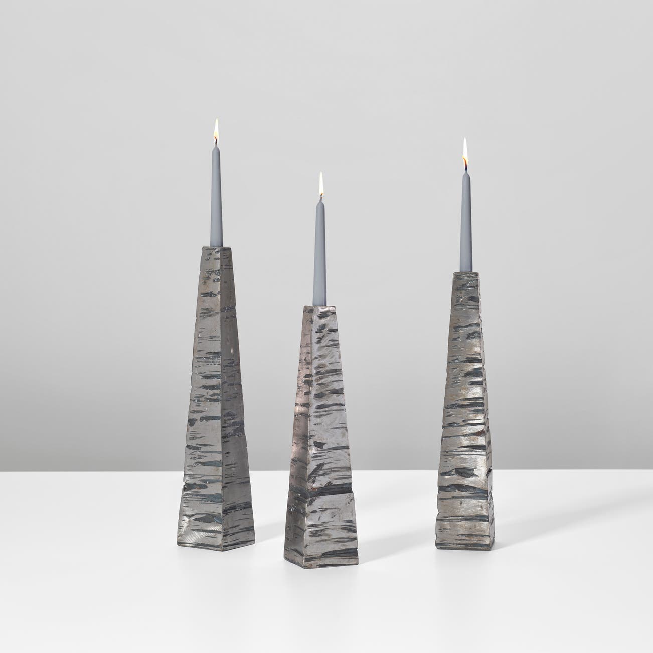 Produced in France. One holder number 3 and two holders number 4 from the edition of 25 sets of three candle holders. Underside of one impressed B. VENET 02/3 / 25 and underside of other two impressed B. VENET 02/4 / 25.