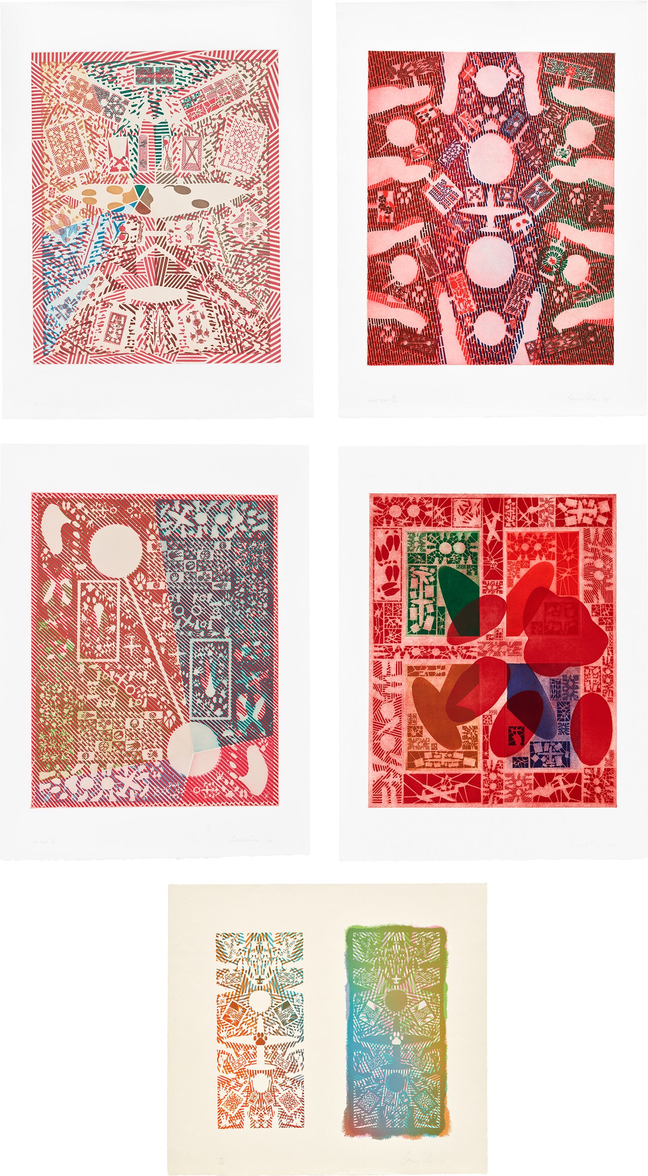 Four etching and aquatints in colours, on Arches paper, and one lithograph in colours, on grey wove paper, with full margins.