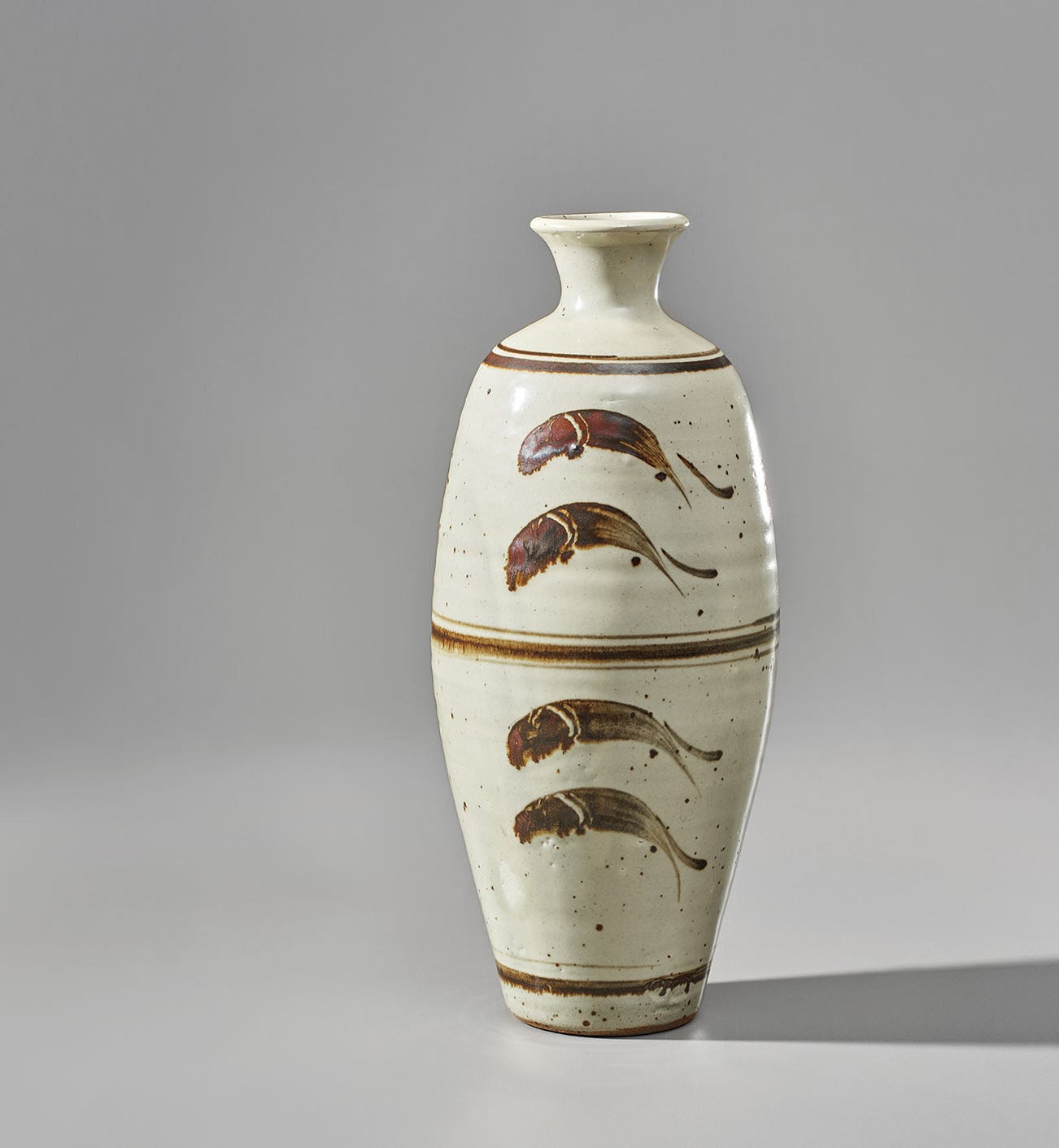 Bernard Leach said of this design, 'free calligraphic use of a brush does not come easily for a European, for we are accustomed from childhood to the heavier pressure of the pencil or the scratch of the pen. For that reason I have best to limit my efforts to a few rhythmic strokes. The fish are made by one brush stroke which is then combed' (Bernard Leach, A Potter's Challenge, p. 132).