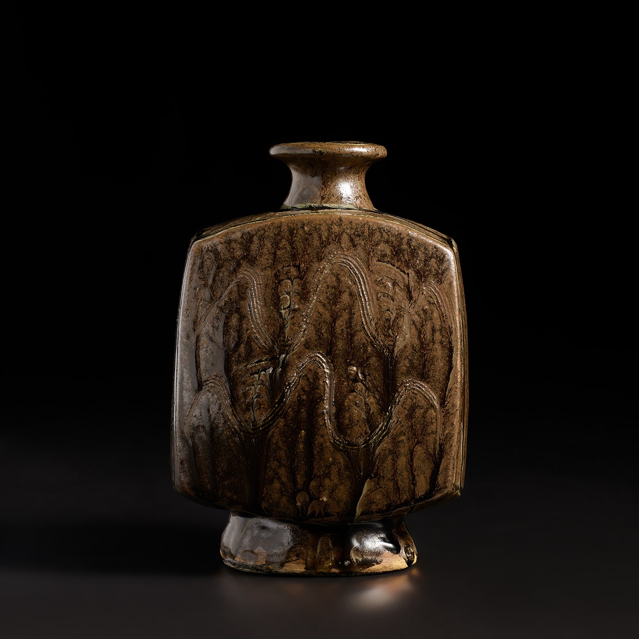 Stoneware with engraved design of trees in a mountainous landscape, beneath an ash glaze.